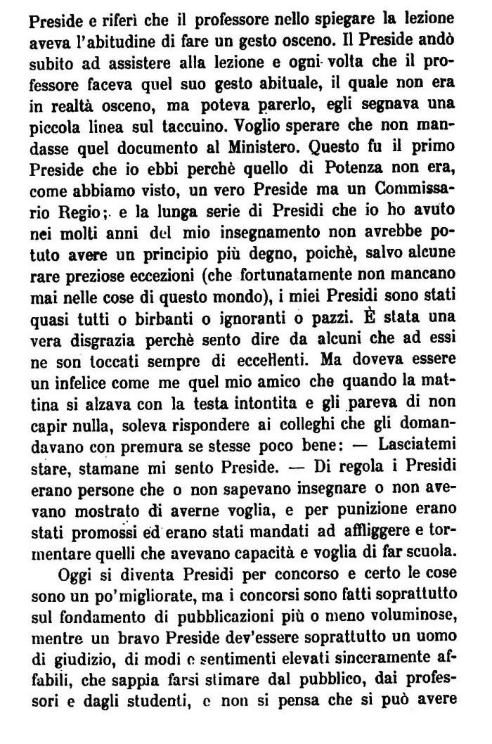 Preside e riferì che il professore nello spiegare la lezione aveva l'abitudine di fare un gesto osceno. Il Preside andò subito ad assistere alla lezione e ogni volta che il professore faceva quel suo gesto abituale, il quale non era in realtà osceno, ma poteva parerlo, egli segnava una piccola linea sul taccuino. Voglio sperare che non mandasse quel documento al Ministero. Questo fu il primo Preside che io ebbi perchè quello di Potenza non era, come abbiamo visto, un vero Preside ma un Commissario Regio;, e la lunga serie di Presidi che io ho avuto nei molti anni del mio insegnamento non avrebbe potuto avere un principio più degno, poiché, salvo alcune rare preziose eccezioni (che fortunatamente non mancano mai nelle cose di questo mondo), i miei Presidi sono stati quasi tutti o birbanti o ignoranti o pazzi. È stata una vera disgrazia perchè sento dire da alcuni che ad essi ne son toccati sempre di eccellenti. Ma doveva essere un infelice come me quel mio amico che quando la mattina si alzava con la testa intontita e gli pareva di non capir nulla, soleva rispondere ai colleghi che gli domandavano con premura se stesse poco bene : — Lasciatemi stare, stamane mi sento Preside. — Di regola i Presidi erano persone che o non sapevano insegnare o non avevano mostrato di averne voglia, e per punizione erano stati promossi ed erano stati mandati ad affliggere e tormentare quelli che avevano capacità e voglia di far scuola.