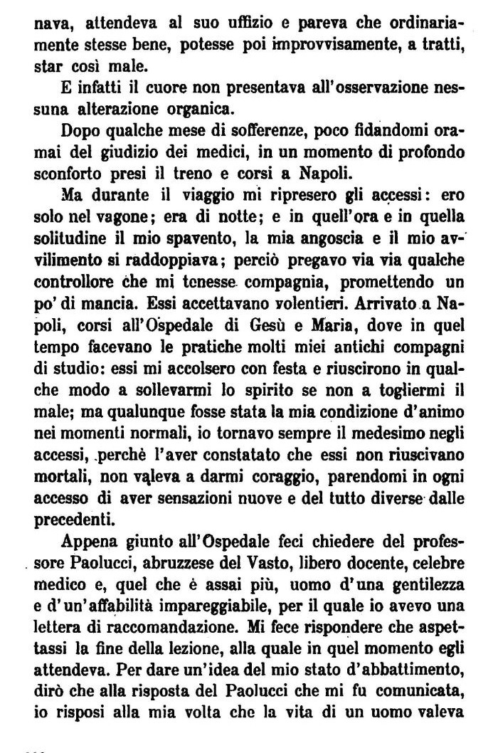 Ma durante il viaggio mi ripresero gli accessi: ero solo nel vagone; era di notte; e in quell'ora e in quella solitudine il mio spavento, la mia angoscia e il mio avvilimento si raddoppiava ; perciò pregavo via via qualche controllore che mi tenesse compagnia, promettendo un po' di mancia. Essi accettavano volentieri. Arrivato a Napoli, corsi all'Ospedale di Gesù e Maria, dove in quel tempo facevano le pratiche molti miei antichi compagni di studio: essi mi accolsero con festa e riuscirono in qualche modo a sollevarmi lo spirito se non a togliermi il male; ma qualunque fosse stata la mia condizione d'animo nei momenti normali, io tornavo sempre il medesimo negli accessi, perchè l'aver constatato che essi non riuscivano mortali, non valeva a darmi coraggio, parendomi in ogni accesso di aver sensazioni nuove e del tutto diverse dalle precedenti.