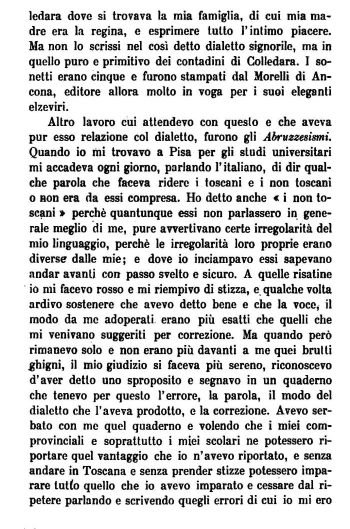 Altro lavoro cui attendevo con questo e che aveva pur esso relazione col dialetto, furono gli Abruzzesismi. Quando io mi trovavo a Pisa per gli studi universitari mi accadeva ogni giorno, parlando l'italiano, di dir qualche parola che faceva ridere i toscani e i non toscani o non era da essi compresa. Ho detto anche « i non toscani » perchè quantunque essi non parlassero in generale meglio di me, pure avvertivano certe irregolarità del mio linguaggio, perchè le irregolarità loro proprie erano diverse dalle mie; e dove io inciampavo essi sapevano andar avanti con passo svelto e sicuro. A quelle risatine io mi facevo rosso e mi riempivo di stizza, e qualche volta ardivo sostenere che avevo detto bene e che la voce, il modo da me adoperati erano più esatti che quelli che mi venivano suggeriti per correzione. Ma quando però rimanevo solo e non erano più davanti a me quei bruiti ghigni, il mio giudizio si faceva più sereno, riconoscevo d'aver detto uno sproposito e segnavo in un quaderno che tenevo per questo l'errore, la parola, il modo del dialetto che l'aveva prodotto, e la correzione. Avevo serbato con me quel quaderno e volendo che i miei comprovinciali e soprattutto i miei scolari ne potessero riportare quel vantaggio che io n'avevo riportato, e senza andare in Toscana e senza prender stizze potessero imparare tutto quello che io avevo imparato e cessare dai ripetere parlando e scrivendo quegli errori di cui io mi ero