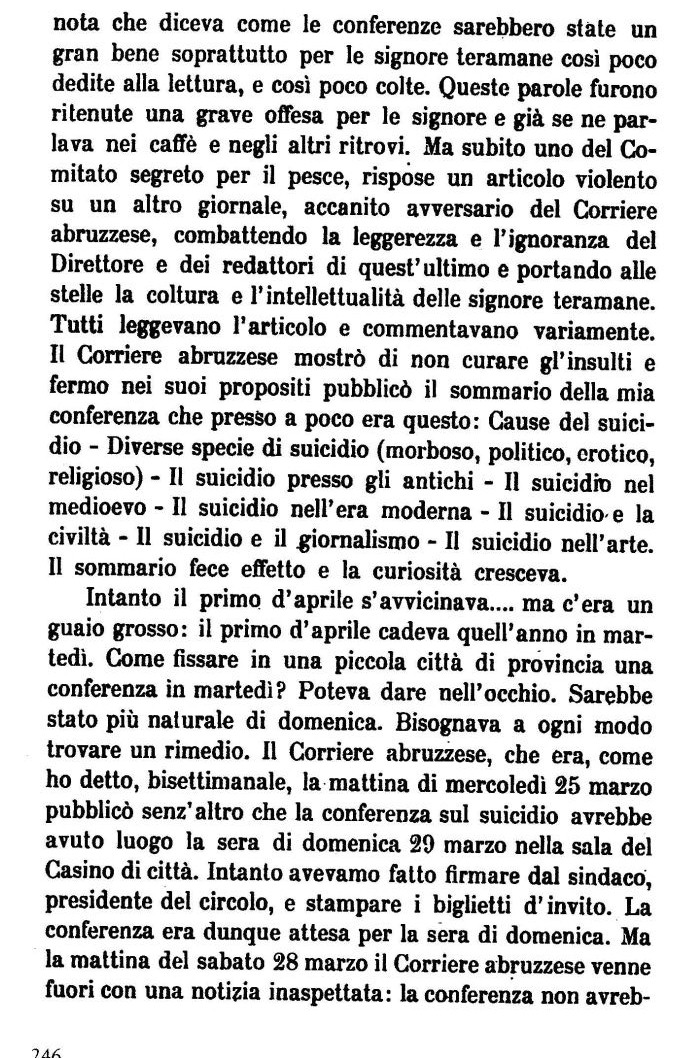 nota che diceva come le conferenze sarebbero state un gran bene soprattutto per le signore teramane così poco dedite alla lettura, e così poco colte. Queste parole furono ritenute una grave offesa per le signore e già se ne parlava nei caffè e negli altri ritrovi. Ma subito uno del Comitato segreto per il pesce, rispose un articolo violento su un altro giornale, accanito avversario del Corriere abruzzese, combattendo la leggerezza e l'ignoranza del Direttore e dei redattori di quest'ultimo e portando alle stelle la coltura e l'intellettualità delle signore teramane. Tutti leggevano l'articolo e commentavano variamente. Il Corriere abruzzese mostrò di non curare gl'insulti e fermo nei suoi propositi pubblicò il sommario della mia conferenza che presso a poco era questo: Cause del suicidio - Diverse specie di suicidio (morboso, politico, erotico, religioso) - Il suicidio presso gli antichi - Il suicidio nel medioevo - Il suicidio nell'era moderna - Il suicidio e la civiltà - Il suicidio e il giornalismo - Il suicidio nell'arte. 11 sommario fece effetto e la curiosità cresceva.