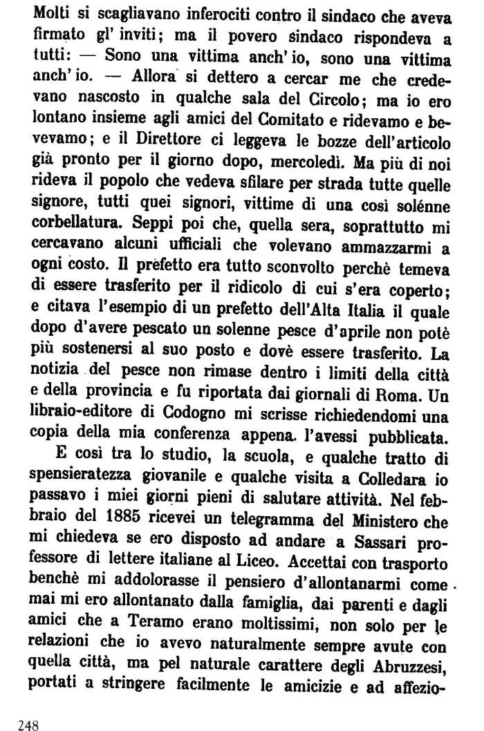 Molti si scagliavano inferociti contro il sindaco che aveva firmato gì' inviti; ma il povero sindaco rispondeva a tutti: — Sono una vittima anch'io, sono una vittima anch' io. — Allora si dettero a cercar me che credevano nascosto in qualche sala del Circolo; ma io ero lontano insieme agli amici del Comitato e ridevamo e bevevamo; e il Direttore ci leggeva le bozze dell'articolo già pronto per il giorno dopo, mercoledì. Ma più di noi rideva il popolo che vedeva sfilare per strada tutte quelle signore, tutti quei signori, vittime di una così solènne corbellatura. Seppi poi che, quella sera, soprattutto mi cercavano alcuni ufficiali che volevano ammazzarmi a ogni costo. Il prefetto era tutto sconvolto perchè temeva di essere trasferito per il ridicolo di cui s'era coperto; e citava l'esempio di un prefetto dell'Alta Italia il quale dopo d'avere pescato un solenne pesce d'aprile non potè più sostenersi al suo posto e dovè essere trasferito. La notizia del pesce non rimase dentro i limiti della città e della provincia e fu riportata dai giornali di Roma. Un libraio-editore di Codogno mi scrisse richiedendomi una copia della mia conferenza appena, l'avessi pubblicata.