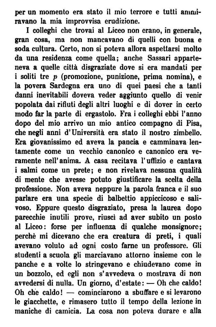 I colleghi che trovai al Liceo non erano, in generale, gran cosa, ma non mancavano di quelli con buona e soda cultura. Certo, non si poteva allora aspettarsi molto da una residenza come quella; anche Sassari apparteneva a quelle città disgraziate dove si era mandati per i soliti tre p (promozione, punizione, prima nomina), e la povera Sardegna era uno di quei paesi che a tanti danni inevitabili doveva veder aggiunto quello di venir popolata dai rifiuti degli altri luoghi e di dover in certo modo far la parte di ergastolo. Fra i colleglli ebbi l'anno dopo del mio arrivo un mio antico compagno di Pisa, che negli anni d'Università era stato il nostro zimbello. Era giovanissimo ed aveva la pancia e camminava lentamente come un vecchio canonico e canonico era veramente nell'anima. A casa recitava l'uffìzio e cantava i salmi come un prete; e non rivelava nessuna qualità di mente che avesse potuto giustificare la scelta della professione. Non aveva neppure la parola franca e il suo parlare era una specie di balbettio appiccicoso e sali-voso. Eppure questo disgraziato, presa la laurea dopo parecchie inutili prove, riuscì ad aver subito un posto al Liceo: forse per influenza di qualche monsignore; perchè mi dicevano che era creatura di preti, i quali avevano voluto ad ogni costo farne un professore. Gli studenti a scuola gli marciavano attorno insieme con le panche e a volte lo stringevano e chiudevano come in un bozzolo, ed egli non s'avvedeva o mostrava di non avvedersi di nulla. Un giorno, d'estate: — Oh che caldo! Oh che caldo ! — cominciarono a sbuffare e si levarono le giacchette, e rimasero tutto il tempo della lezione in maniche di camicia. La cosa non poteva durare e alla