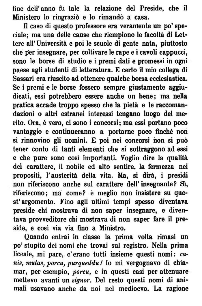 Il caso di questo professore era veramente un po' speciale; ma una delle cause che riempiono le facoltà di Lettere all' Università e poi le scuole di gente nata, piuttosto che pier insegnare, per coltivare le rape e i cavoli cappucci, sono le borse di studio e i premi dati e promessi in ogni paese agli studenti di letteratura. E certo il mio collega di Sassari era riuscito ad ottenere qualche borsa ecclesiastica. Se i premi e le borse fossero sempre giustamente aggiudicali, essi potrebbero essere anche un bene; ma nella pratica accade troppo spesso che la pietà e le raccomandazioni o altri estranei interessi tengano luogo del merito. Ora, è vero, ci sono i concorsi; ma essi portano poco vantaggio e continueranno a portarne poco finché non si rinnovino gli uomini. E poi nei concorsi non si può tener conto di tanti elementi che si sottraggono ad essi e che pure sono così importanti. Voglio dire la qualità del carattere, il nobile ed alto sentire, la fermezza nei propositi, l'austerità della vita. Ma, si dirà, i presidi non riferiscono anche sul carattere dell' insegnante? Sì, riferiscono; ma come? è meglio non insistere su quest'argomento. Fino agli ultimi tempi spesso diventava preside chi mostrava di non saper insegnare, e diventava provveditore chi mostrava di non saper fere il preside, e così via via fino a Ministro.