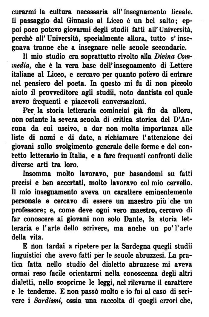 Insomma molto lavoravo, pur basandomi su fatti precisi e ben accertati, molto lavoravo col mio cervello. Il mio insegnamento aveva un carattere eminentemente personale e cercavo di essere un maestro più che un professore; e, come deve ogni vero maestro, cercavo di far conoscere ai giovani non solo Dante, la storia letteraria e l'arte dello scrivere, ma anche un po'l'arie della vita.
