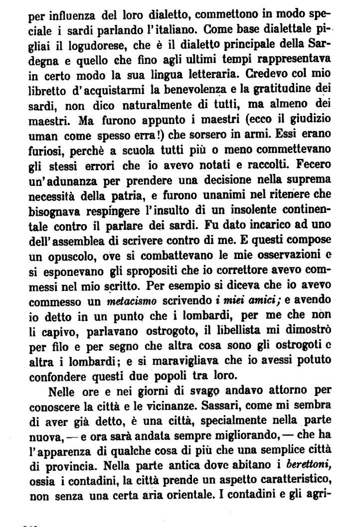 per influenza del loro dialetto, commettono in modo speciale i sardi parlando l'italiano. Come base dialettale pigliai il logudorese, che è il dialetto principale della Sardegna e quello che fino agli ultimi tempi rappresentava in certo modo la sua lingua letteraria. Credevo col mio libretto d'acquistarmi la benevolenza e la gratitudine dei sardi, non dico naturalmente di tutti, ma almeno dei maestri. Ma furono appunto i maestri (ecco il giudizio uman come spesso erra !) che sorsero in armi. Essi erano furiosi, perchè a scuola tutti più o meno commettevano gli stessi errori che io avevo notati e raccolti. Fecero un'adunanza per prendere una decisione nella suprema necessità della patria, e furono unanimi nel ritenere che bisognava respingere l'insulto di un insolente continentale contro il parlare dei sardi. Fu dato incarico ad uno dell'assemblea di scrivere contro di me. E questi compose un opuscolo, ove si combattevano le mie osservazioni e si esponevano gli spropositi che io correttore avevo commessi nel mio scritto. Per esempio si diceva che io avevo commesso un metacismo scrivendo i miei amici; e avendo
