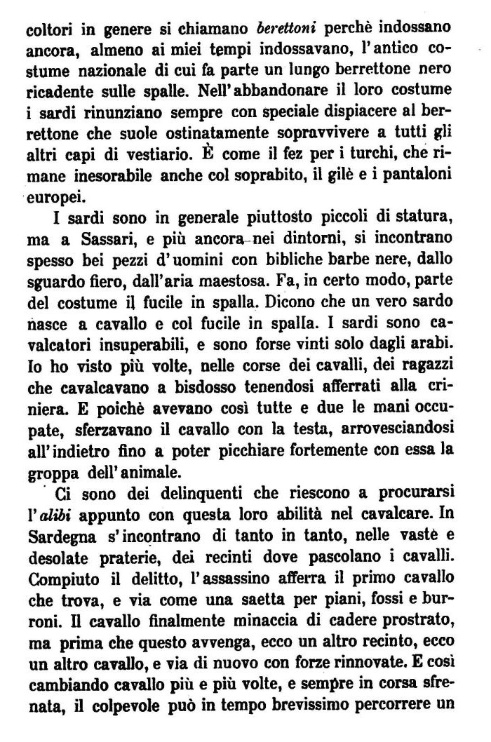 I sardi sono in generale piuttosto piccoli di statura, ma a Sassari, e più ancora nei dintorni, si incontrano spesso bei pezzi d'uomini con bibliche barbe nere, dallo sguardo fiero, dall'aria maestosa. Fa, in certo modo, parte del costume il fucile in spalla. Dicono che un vero sardo nasce a cavallo e col fucile in spalla. I sardi sono cavalcatori insuperabili, e sono forse vinti solo dagli arabi. Io ho visto più volte, nelle corse dei cavalli, dei ragazzi che cavalcavano a bisdosso tenendosi afferrati alla criniera. E poiché avevano così tutte e due le mani occupate, sferzavano il cavallo con la testa, arrovesciandosi all' indietro fino a poter picchiare fortemente con essa la groppa dell'animale.