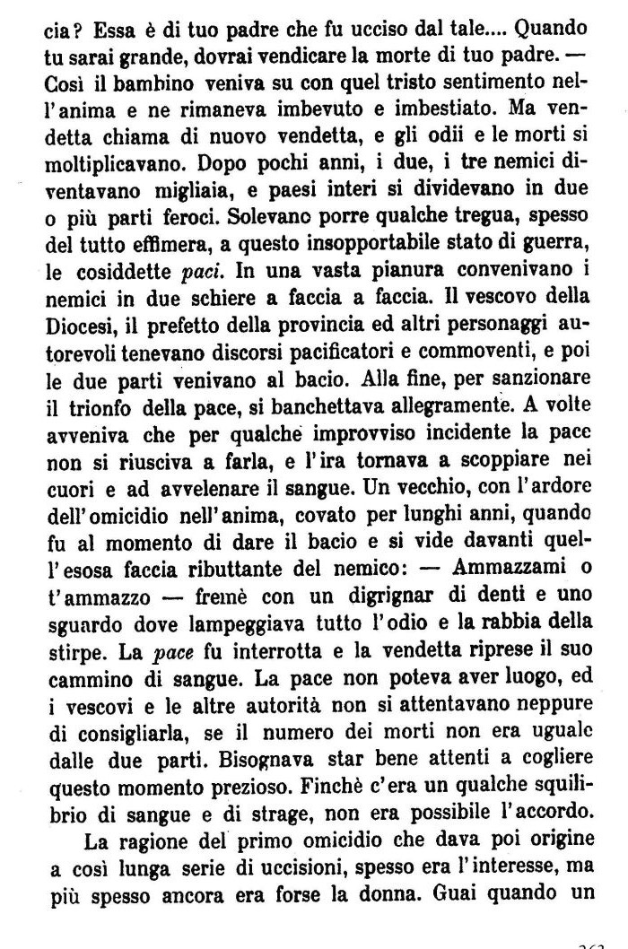 0 più parti feroci. Solevano porre qualche tregua, spesso del tutto effimera, a questo insopportabile stato di guerra, le cosiddette \paci. In una vasta pianura convenivano i nemici in due schiere a faccia a faccia. 11 vescovo della Diocesi, il prefetto della provincia ed altri personaggi autorevoli tenevano discorsi pacificatori e commoventi, e poi le due parti venivano al bacio. Alla fine, per sanzionare il trionfo della pace, si banchettava allegramente. A volte avveniva che per qualche improvviso incidente la pace non si riusciva a farla, e l'ira tornava a scoppiare nei cuori e ad avvelenare il sangue. Un vecchio, con l'ardore dell'omicidio nell'anima, covato per lunghi anni, quando fu al momento di dare il bacio e si vide davanti quel-l'esosa faccia ributtante del nemico: — Ammazzami o t'ammazzo — fremè con un digrignar di denti e uno sguardo dove lampeggiava tutto l'odio e la rabbia della stirpe. La pace fu interrotta e la vendetta riprese il suo cammino di sangue. La pace non poteva aver luogo, ed