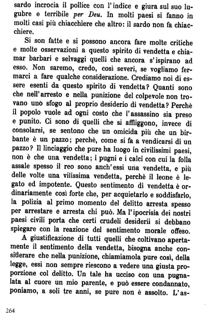 A giustificazione di tutti quelli che coltivano apertamente il sentimento della vendetta, bisogna anche considerare che nella punizione, chiamiamola pure così, della legge, essi non sempre riescono a vedere una giusta proporzione col delitto. Un tale ha ucciso con una pugnalata al cuore un mio parente, e può essere condannato, poniamo, a soli tre anni, se pure non è assolto. L'as-