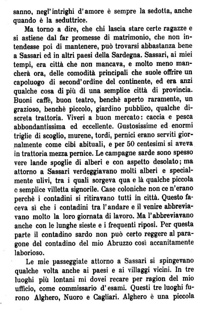 Ma torno a dire, che chi lascia stare certe ragazze e si astiene dal far promesse di matrimonio, che non intendesse poi di mantenere, può trovarsi abbastanza bene a Sassari ed in altri paesi della Sardegna. Sassari, ai miei tempi, era città che non mancava, e molto meno mancherà ora, delle comodità principali che suole offrire un capoluogo di second' ordine del continente, ed era anzi qualche cosa di più di una semplice città di provincia. Buoni caffè, buon teatro, benché aperto raramente, un grazioso, benché piccolo, giardino pubblico, qualche discreta trattoria. Viveri a buon mercato: caccia e pesca abbondantissima ed eccellente. Gustosissime ed enormi triglie di scoglio, murene, tordi, pernici erano serviti giornalmente come cibi abituali, e per 50 centesimi si aveva in trattoria mezza pernice. Le campagne sarde sono spesso vere lande spoglie di alberi e con aspetto desolato ; ma attorno a Sassari verdeggiavano molti alberi e specialmente ulivi, tra i quali sorgeva qua e là qualche piccola e semplice villetta signorile. Case coloniche non ce n'erano perchè i contadini si ritiravano tutti in città. Questo faceva sì che i contadini tra l'andare e il venire abbreviavano molto la loro giornata di lavoro. Ma l'abbreviavano anche con le lunghe sieste e i frequenti riposi. Per questa parte il contadino sardo non può certo reggere al paragone del contadino del mio Abruzzo così accanitamente laborioso.