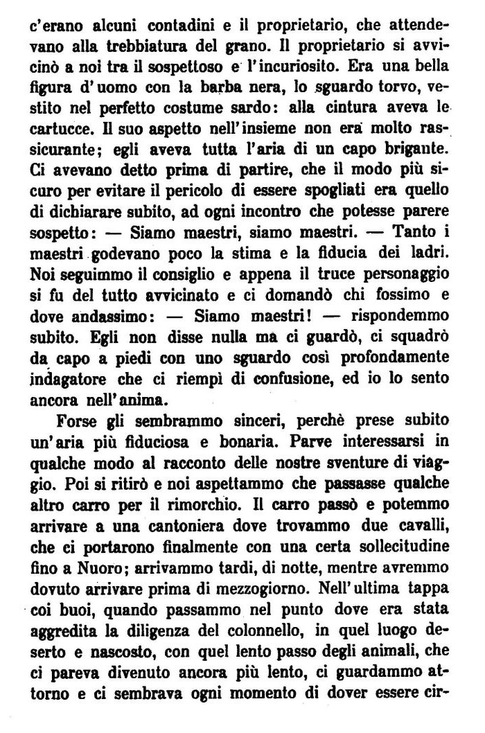 c'erano alcuni contadini e il proprietario, che attendevano alla trebbiatura del grano. Il proprietario si avvicinò a noi tra il sospettoso e l'incuriosito. Era una bella figura d'uomo con la barba nera, lo sguardo torvo, vestito nel perfetto costume sardo: alla cintura aveva le cartucce. Il suo aspetto nell'insieme non era molto rassicurante; egli aveva tutta l'aria di un capo brigante. Ci avevano detto prima di partire, che il modo più sicuro per evitare il pericolo di essere spogliati era quello di dichiarare subito, ad ogni incontro che potesse parere sospetto: — Siamo maestri, siamo maestri. — Tanto i maestri godevano poco la stima e la fiducia dei ladri. Noi seguimmo il consiglio e appena il truce personaggio si fu del tutto avvicinato e ci domandò chi fossimo e dove andassimo: — Siamo maestri! — rispondemmo subito. Egli non disse nulla ma ci guardò, ci squadrò da capo a piedi con uno sguardo cosi profondamente indagatore che ci riempì di confusione, ed io lo sento ancora nell'anima.