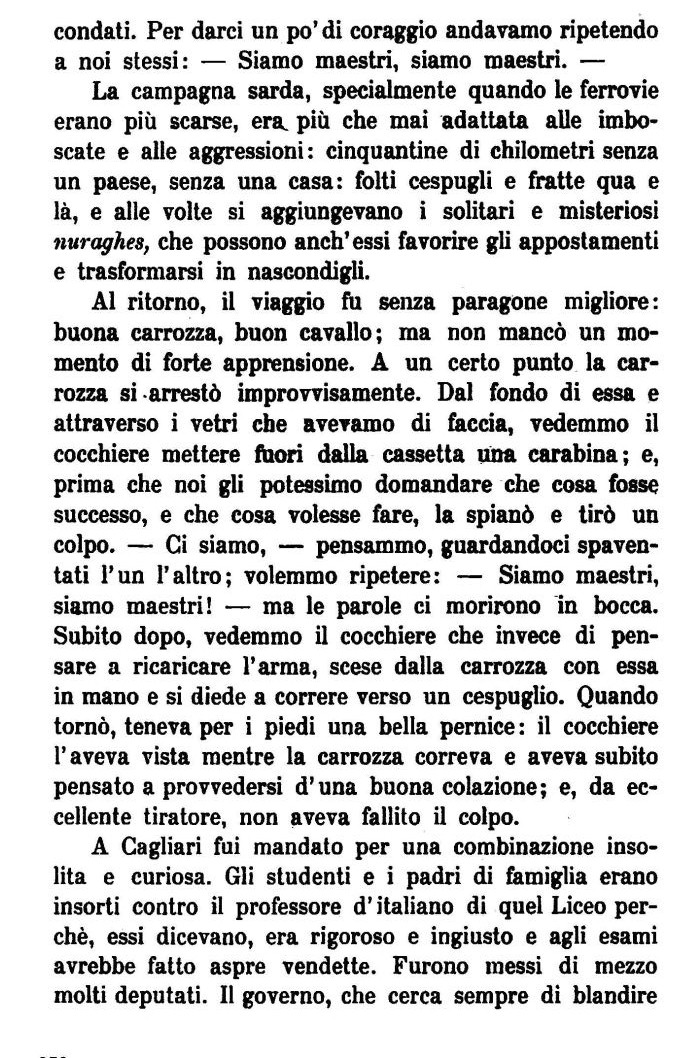 A Cagliari fui mandato per una combinazione insolita e curiosa. Gli studenti e i padri di famiglia erano insorti contro il professore d'italiano di quel Liceo perchè, essi dicevano, era rigoroso e ingiusto e agli esami avrebbe fatto aspre vendette. Furono messi di mezzo molti deputati. Il governo, che cerca sempre di blandire