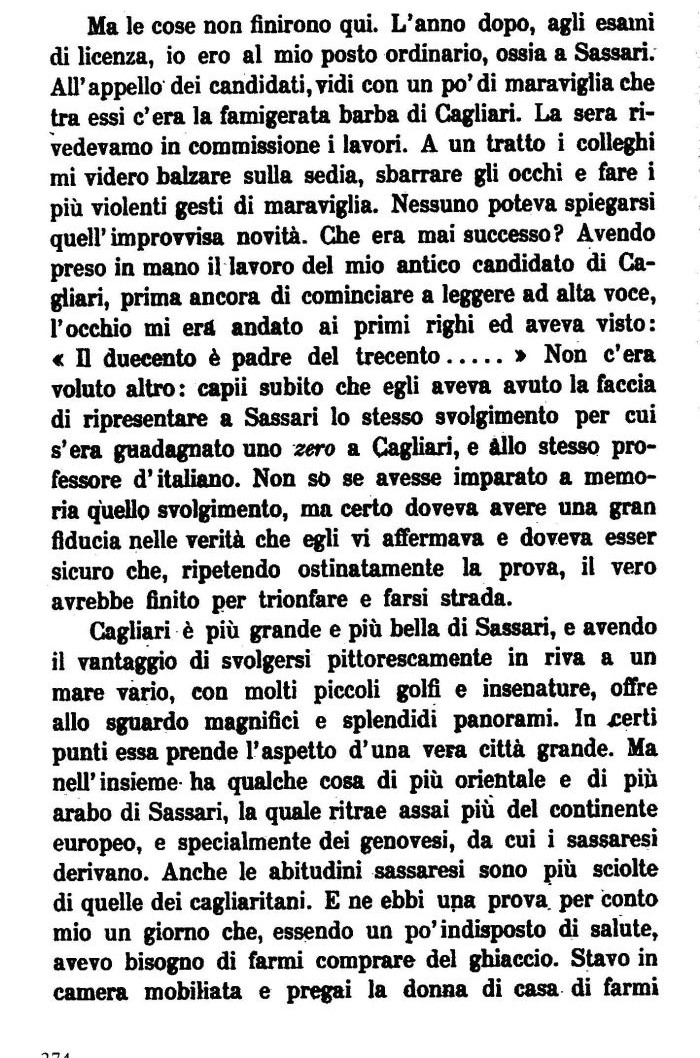 Ma le cose non finirono qui. L'anno dopo, agli esami di licenza, io ero al mio posto ordinario, ossia a Sassari. All' appello dei candidati, vidi con un po'di maraviglia che tra essi c'era la famigerata barba di Cagliari. La sera rivedevamo in commissione i lavori. A un tratto i colleghi mi videro balzare sulla sedia, sbarrare gli occhi e fare i più violenti gesti di maraviglia. Nessuno poteva spiegarsi quell'improvvisa novità. Che era mai successo? Avendo preso in mano il lavoro del mio antico candidato di Cagliari, prima ancora di cominciare a leggere ad alta voce, l'occhio mi era andato ai primi righi ed aveva visto: