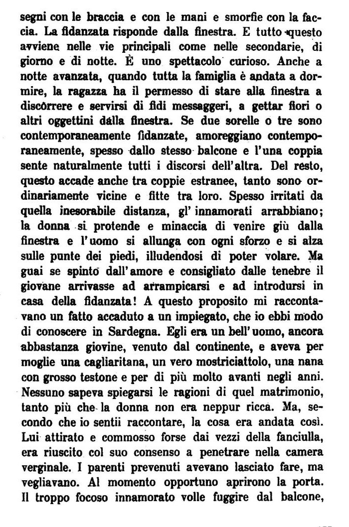 segni con le braccia e con le mani e smorfie con la faccia. La fidanzata risponde dalla finestra. E tutto «questo avviene nelle vie principali come nelle secondarie, di giorno e di notte. Č uno spettacolo curioso. Anche a notte avanzata, quando tutta la famiglia č andata a dormire, la ragazza ha il permesso di stare alla finestra a discórrere e servirsi di fidi messaggeri, a gettar fiori o altri oggettini dalla finestra. Se due sorelle o tre sono contemporaneamente fidanzate, amoreggiano contemporaneamente, spesso dallo stesso balcone e l'una coppia sente naturalmente tutti i discorsi dell'altra. Del resto, questo accade anche tra coppie estranee, tanto sono ordinariamente vicine e fitte tra loro. Spesso irritati da quella inesorabile distanza, gģ' innamorati arrabbiano; la donna si protende e minaccia di venire gił dalla finestra e l'uomo si allunga con ogni sforzo e si alza sulle punte dei piedi, illudendosi di poter volare. Ma guai se spinto dall'amore e consigliato dalle tenebre il giovane arrivasse ad arrampicarsi e ad introdursi in casa della fidanzata! A questo proposito mi raccontavano un fatto accaduto a un impiegato, che io ebbi modo di conoscere in Sardegna. Egli era un beli' uomo, ancora abbastanza giovine, venuto dal continente, e aveva per moglie una cagliaritana, un vero mostriciattolo, una nana con grosso testone e per di pił molto avanti negli anni. Nessuno sapeva spiegarsi le ragioni di quel matrimonio, tanto pił che la donna non era neppur ricca. Ma, secondo che io sentii raccontare, la cosa era andata cosģ. Lui attirato e commosso forse dai vezzi della fanciulla, era riuscito col suo consenso a penetrare nella camera verginale. I parenti prevenuti avevano lasciato fare, ma vegliavano. Al momento opportuno aprirono la porta. Il troppo focoso innamorato volle fuggire dal balcone,