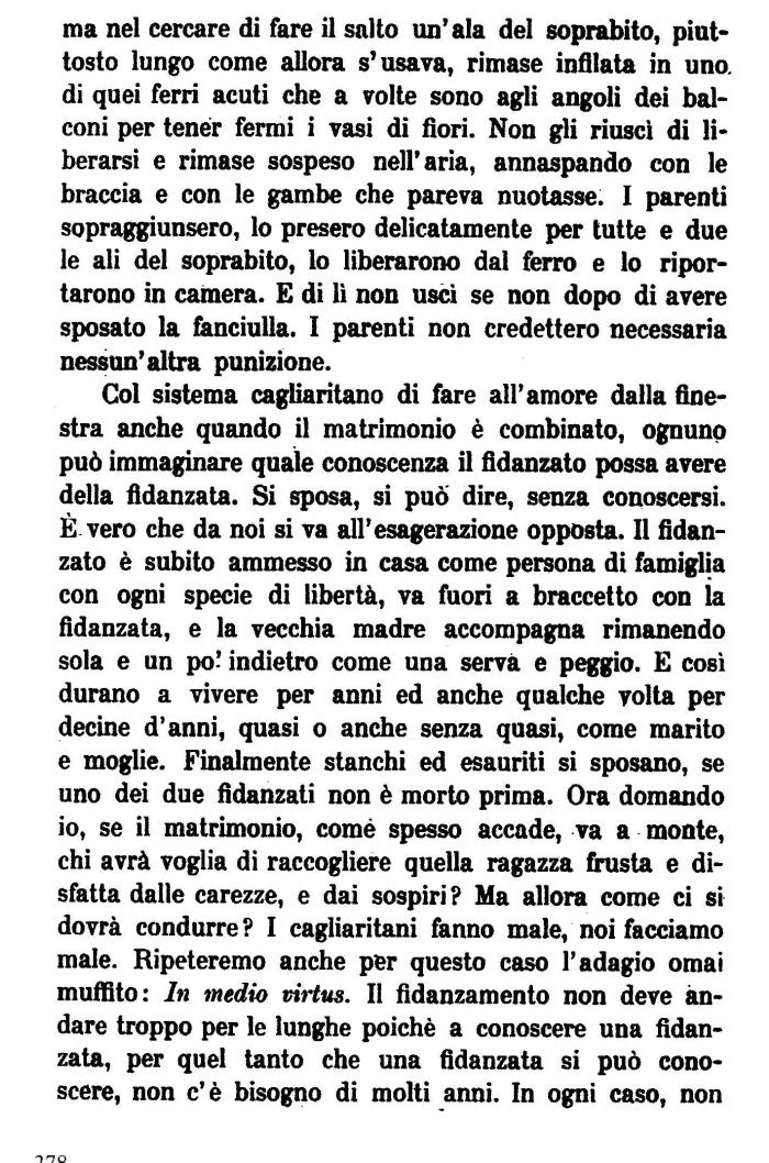 Col sistema cagliaritano di fare all'amore dalla finestra anche quando il matrimonio è combinato, ognuno può immaginare quale conoscenza il fidanzato possa avere delia fidanzata. Si sposa, si può dire, senza conoscersi. È vero che da noi si va all'esagerazione opposta. Il fidanzato è subito ammesso in casa come persona di famiglia con ogni specie di libertà, va fuori a braccetto con la fidanzata, e la vecchia madre accompagna rimanendo sola e un po! indietro come una serva e peggio. E così durano a vivere per anni ed anche qualche volta per decine d'anni, quasi o anche senza quasi, come marito e moglie. Finalmente stanchi ed esauriti si sposano, se uno dei due fidanzati non è morto prima. Ora domando io, se il matrimonio, comé spesso accade, va a monte, chi avrà voglia di raccogliere quella ragazza fhista e disfatta dalle carezze, e dai sospiri ? Ma allora come ci si dovrà condurre? I cagliaritani fanno male, noi facciamo male. Ripeteremo anche per questo caso l'adagio ornai muffito: In medio virtus. Il fidanzamento non deve andare troppo per le lunghe poiché a conoscere una fidanzata, per quel tanto che una fidanzata si può conoscere, non c'è bisogno di molti anni. In ogni caso, non