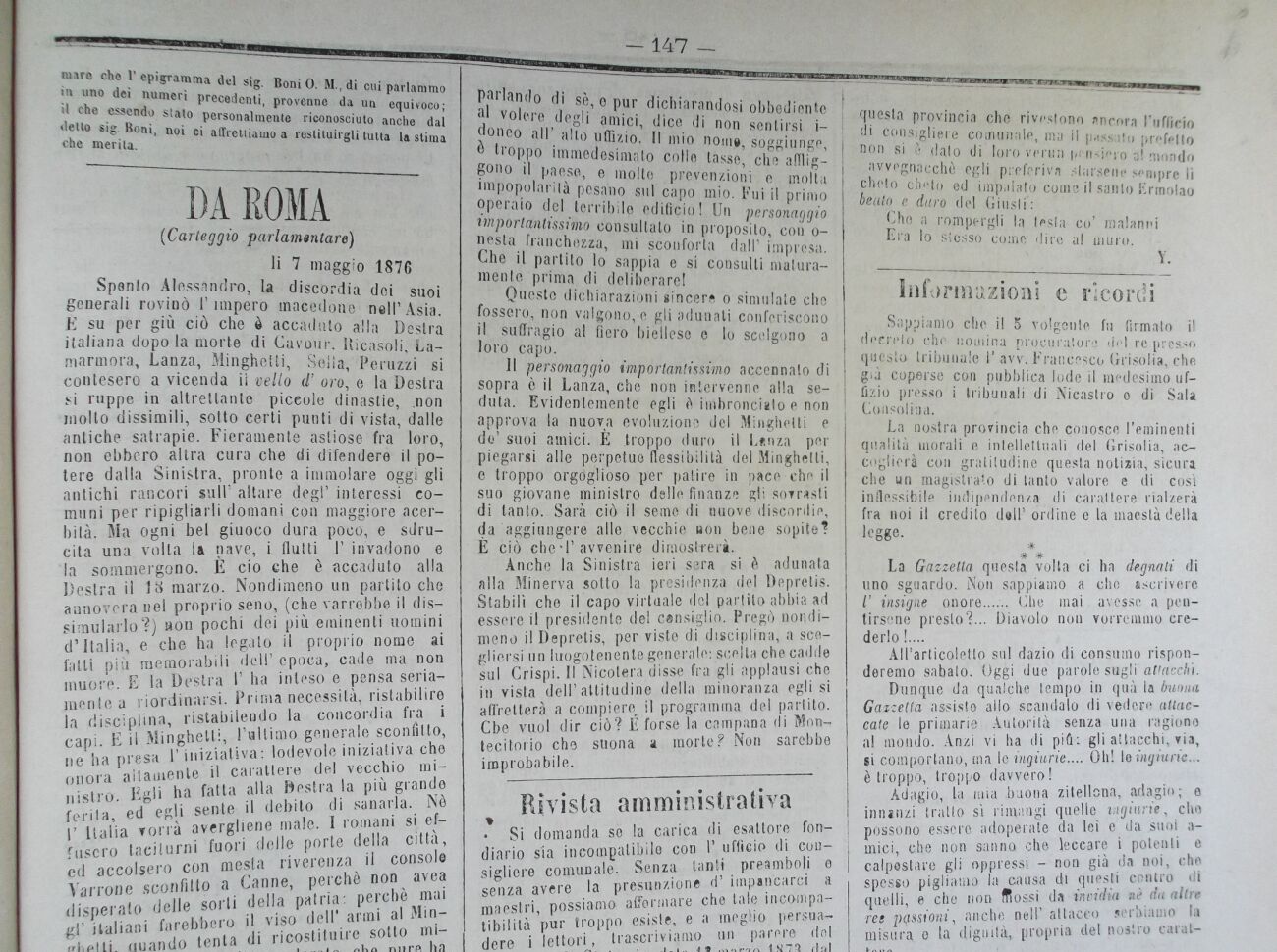 Anche la Sinistra ieri sera si è adunata alla Minerva sotto la presidenza del Depretis. Stabilì che il capo virtuale del partito abbia ad essere il presidente del consiglio. Pregò nondimeno il Depretis, per viste di disciplina, a scegliersi un luogotenente generale: scelta che cadde sul Crispi. Il Nicolera disse fra gli applausi che in vista dell'attitudine della minoranza egli si affretterà a compiere il programma del partito. Cbe vuol dir ciò? É forse la campana di Moth tecitorio che suona a morte ? Non sarebbe improbabile.