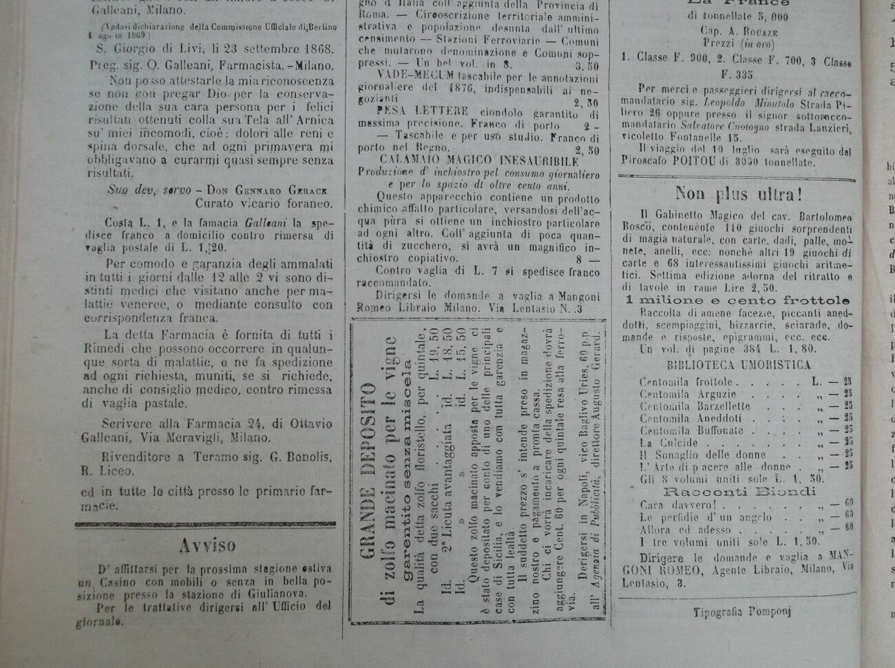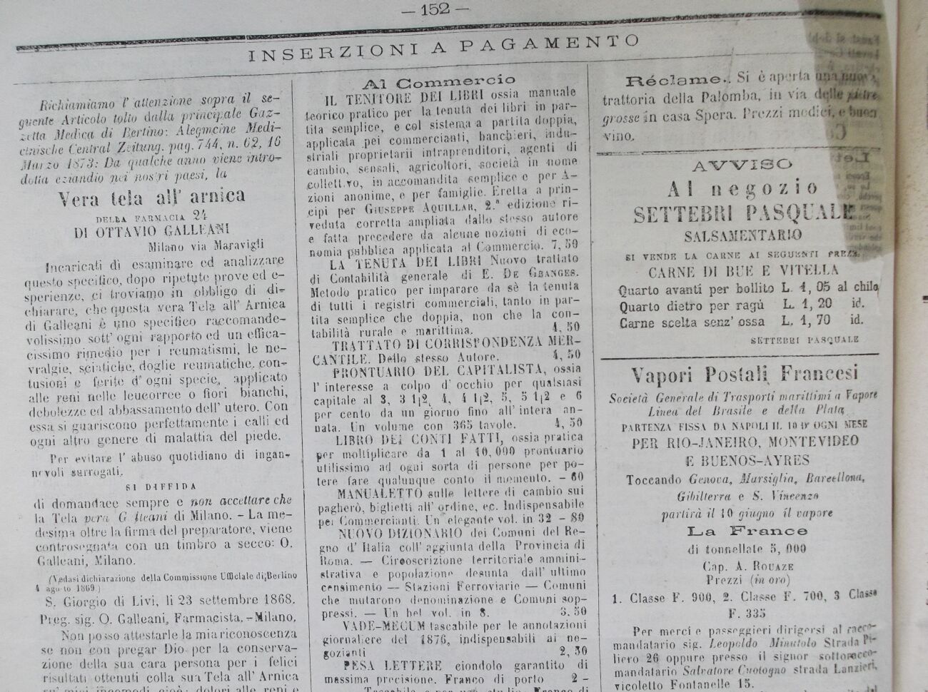 81 d4 ffi0 a di domandaec sempre e non accettare che la Tela pera G jleani eli Milano. - La medesima oltre la firma del preparatore, viene eorttrosegiiata con un timbro a secco: 0. Galleani, Milano. (Vadasi dichiarazione della Commissione UQJclalc di;Bei lino 4 ago-lo ltttì9.) S. Giorgio di Livi, li 23 settembre 1868, Preg. sjg. Q. Gqlleani, Farmacista, ^Milano, Non po vso attestarle la mia riconoscenza se non con pregar Dio- per la conservazione della sua cara persona per i felici risultati ottenuti colla sua Tela all'Arnica A. rl^Lini olla rr»m <» -A.1 Oommer^cio IL TENITORE JDEI LIBRI ossia manuale teorico pratico per la tenuta dei libri in partila semplice, e col sistema a partila doppia, applicata pei commercianti, hanc-òieri, industriali proprietarii intraprenditori, agenti di eambio, sensali, agricoltori, -società in -nome £ollett,Yo, in accomandita semplice e per A-zio ni anonime, e per famiglie. Eretta a principi per Giuseppe Aquillah, 2." edizione riveduta .corretta ampi i ai a dall-o stesso autore e fatta precedere da alcune nozioni di economia pubblica applicata al Commerci. 7, 50 LA TENUTA DEI LIBRI Nuovo trattato di Contabilità generale di E. De Gba^c.es. Metodi pratico per imparare da sè la tenuta di tutti i registri commerciali, tanto in partila semplice che doppia, non che la contabilità rurale e marittima. 4, 50 TRATTATO DI CORRISPONDENZA MERCANTILE. Dello stess.0 Autore. 4, f»0 PRONTUARIO DEL CAPITALISTA, ossia 1' interesse a colpo d1 occhio per qualsiasi capitale al 3, 3 l,2t 4, 4 l,2, 5, 5 t,2 e 6 per cento da un giorno fino all' intera annata. Un volume con 3i>5 tavole. 4, 50 LIBRO DEI CONTI FATTI, ossia pratica per molliplieare da 1 al 10,000 prontuario utilissimo ad ogni sorta di persone per potere fare qualunque conto il memento. - 60 MANUALETTO «ulle lettere di cambio sui pagherò, biglietti all' ordine, ec. Indispensabile pei Commercianti'. Un elegante voi. iu 32 - £9 NUOVO DIZIONARIO dei Comuni del Regno d'Italia coli'aggiunta della Provincia di Rioma. ¦ Cirooscrizione territoriale amministrativa e popolazione desunta dall' ultimo censimento Stazioni Ferroviario Comuni che mutarono denominazione e Comuni soppressi. Un bH voi. in 8. 3. 50 VADE-MECUM tascabile per le annotazioni giornaliere dei 1870, indispensabili ai negozianti 2,50 PESA LETTERE ciondolo garantito di massima precisione. Franco di porto 2 - Reclame.. Si c aporia uua^flp^' trattoria della Palomba, in via grasse m casa Spera. Prezzi mcdidflHHH no. >jr Mi' AVVISO ÀI negozio SETTEBRI PASQUALE'? SALSAMENTARIO 61 VENDE LA CARNE AI SEGUATI » CARNE DI BUE E VITELLA Quarto avanti per bollito L. i, 05 al chila Quarto dietro per ragù L. 1, 20 id. Carne scelta senz' ossa Lf 1, 70 id. settebbi pasquale Vapori Postali Francesi Società Generale di Trasporti marittimi a Vapore Linea del Brasile e della Pinta. PARTENZA FISSA DA NAPOLI IL 10 t>» OGNI MESE PER RIO-JANEIRO, MONTE VIDEO E BUENOS-ÀYKES Toccando Genova, Marsiglia, Barcellona, Gibilterra e S. Vincenzo partirà il 10 giugno il vapore La France di tonnellate 5, 000 Gap. A. Rouaze Prezzi (»ì oro) 1. Classe F. 900, 2. Classe F. 700, 3 Classi F. 33J Per merci e passeggi eri dirigersi al faer*" mandatario sig. Leopoldo Minutalo Strada li oro 26 oppure presso il signor sodome**^ mandatario Salvatore Cnoiogno strada Lamiera vicoletto Fontanelle 15. |