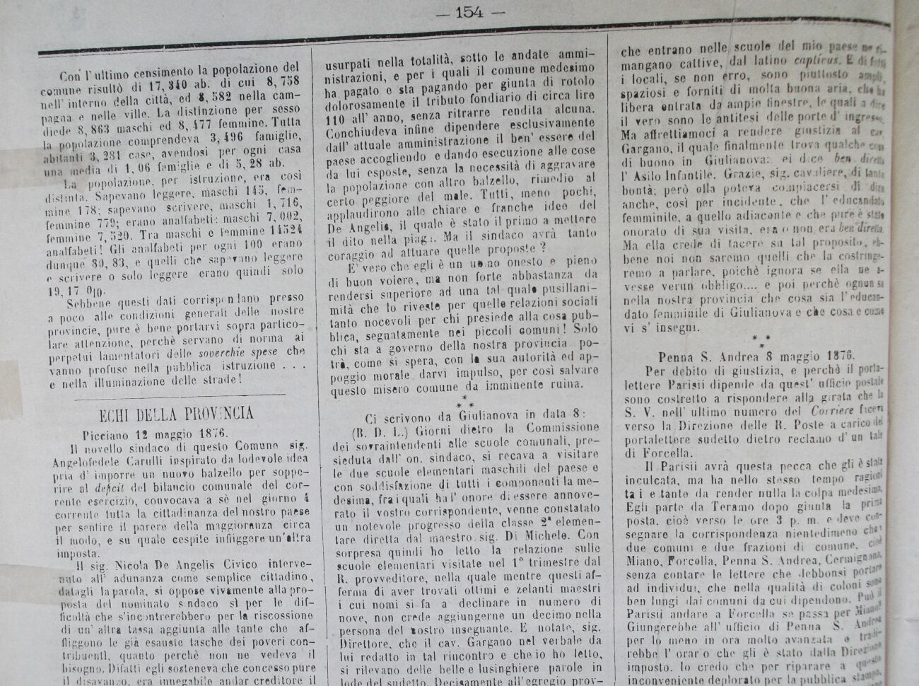 E' vero che egli è un ut.no onesto e pieno di buon volere, ma non forte abbastanza da rendersi superiore ad una tal quali pusillanimità che lo riveste per quelle relazioni sociali tanto nocevoli per chi presiede alla cosa pubblica, segnatamente nei piccoli comuni! Solo chi sta a governo della nostra provincia potrà, come spera, con la sua autorità ed appoggio morale, darvi impulso, per così salvare questo misero comune da imminente ruina.