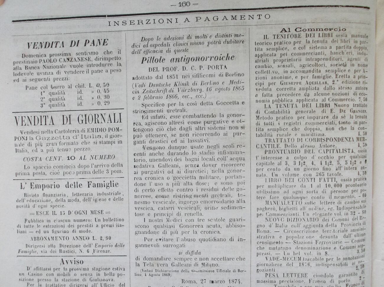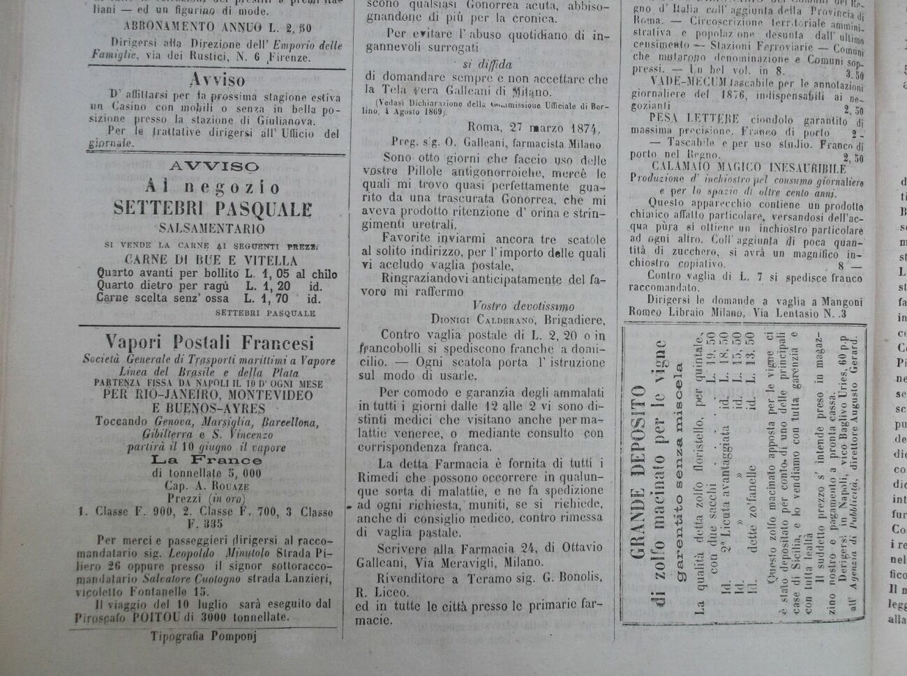 Roma, 27 marzo 1874, Preg. sig. O. Galleani, farmacista Milano Sono otto "giorni phe faccio uso delle vostre Pillole anti gonorroiche, mercè le quali mi trovo quasi perfettamente gua-* rito da una trascurata Gonorrea, che mi aveva prodotto ritenzione d' orina e stringimenti uretrali..