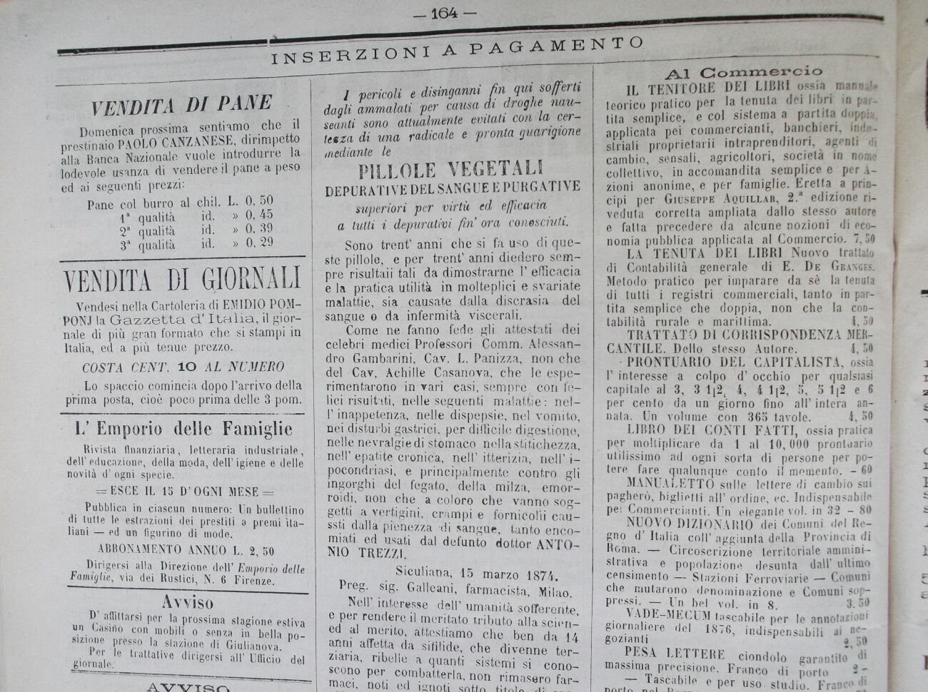 Domenica prossima sentiamo che il prestinaio PAOLO CANZANESE, dirimpetto alla Banca Nazionale vuole introdurre la lodevole usanza di vendere il pane a peso ed ai seguenti prezzi: