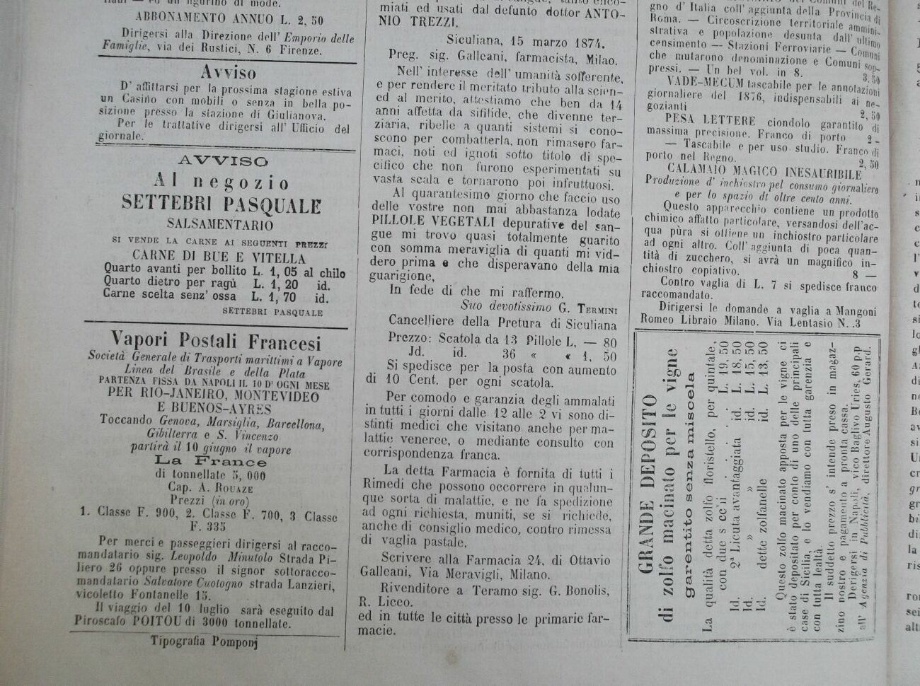 VADE-MECUM tascabile per le annotazioni giornaliere del 1876, indispensabili ai negozianti 2,50 PESA LETTERE ciondolo garantito di massima precisione. Franco di porto 2 - Tascabile e per uso-studio. Franco di porto nel Regno. 2, S6