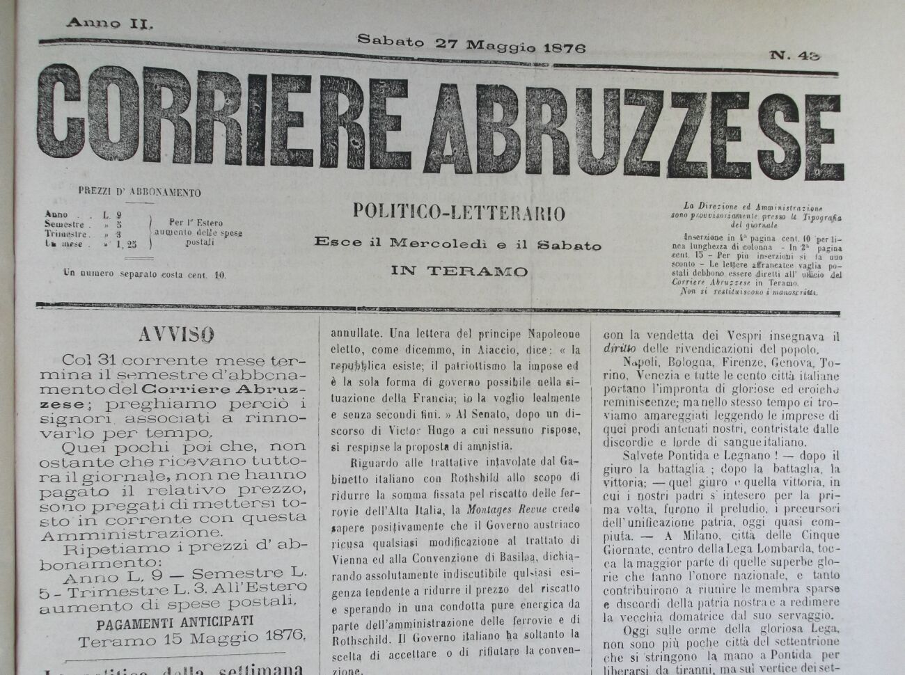 inserzione in ia pagina cent. IO per linea lunghezza di colonna - In :3a pagina " eent. 1$ - Per più inserzioni si fa uuo sconto - Le lettere affrancate» vaglia poetali debbono essere diretti all' ui&cio 4el Corriere Abruzzese in Teramo.