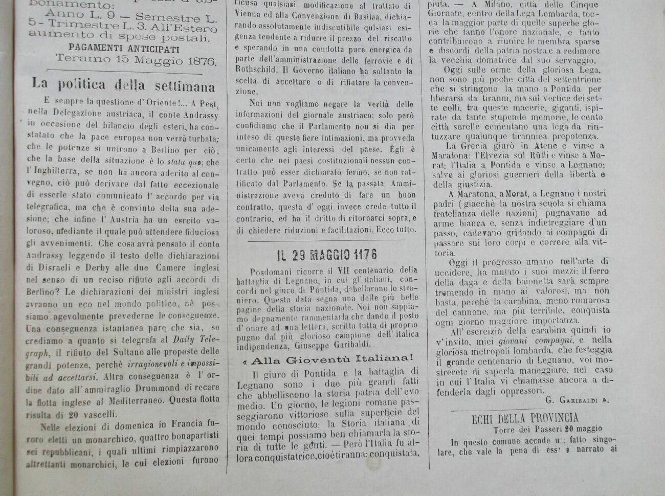Posdomani ricorre il VII centenario, della battaglia di Legnano,, in cui gP italiani, concordi nel giuro di Pontida, debellarono lo. straniero. Questa data segna una delle più belle pagine della storia nazionale. Noi non sappiamo degnamente rammentarla che d ando il posto d' onore ad una lettera, scritta tutta di proprio pugno dal più glorioso campione dell'ilalica^ indipendenza, Giuseppe Garibaldi.,