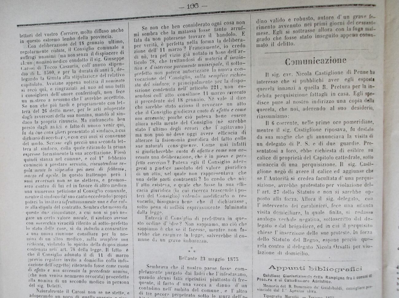 Il sig. cav. Nicola Castiglione di Penne ha interesse che si pubblichi aver egli esposta querela innanzi a quella R. Pretura per la indebita perquisizione fattagli in casa. Egli spedisce pure al nostro indirizzo una copia della querela, che noi, aderendo al suo desiderio, riassumiamo :