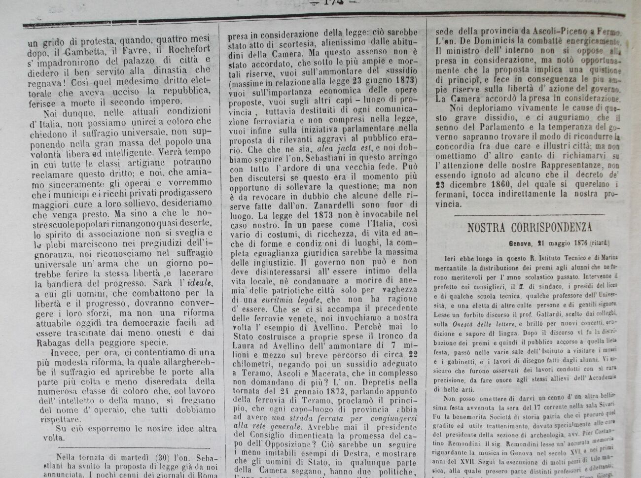 Noi dunque, nelle attuali condizioni d1 Italia, non possiamo unirci a coloro che chiedono il suffragio universale, non supponendo nella gran massa del popolo una volontà libera ed intelligente. Verrà tempo in cui tutte le classi artigiane potranno reclamare questo dritto; e noi, che amiamo sinceramente gli operai e vorremmo che i municipi e i ricchi privati prodigassero maggiori cure a loro sollievo, desideriamo che venga presto. Ma sino a che le nostre scuole popolari rimangono quasi deserte, lo spirito di associazione non si sveglia e U plebi marciscono nei pregiudizi dell'ignoranza, noi riconosciamo nel suffragio universale un' arma che un giorno potrebbe ferire la stessa libertà ,e lacerare la bandiera del progresso. Sarà l'ideale, a cui gli uomini, che combattono per la libertà e il progresso, dovranno convergere i loro sforzi, ma non una riforma attuabile oggidì tra democrazie facili ad essere trascinate dai meno onesti e dai Rabagas della peggiore specie.