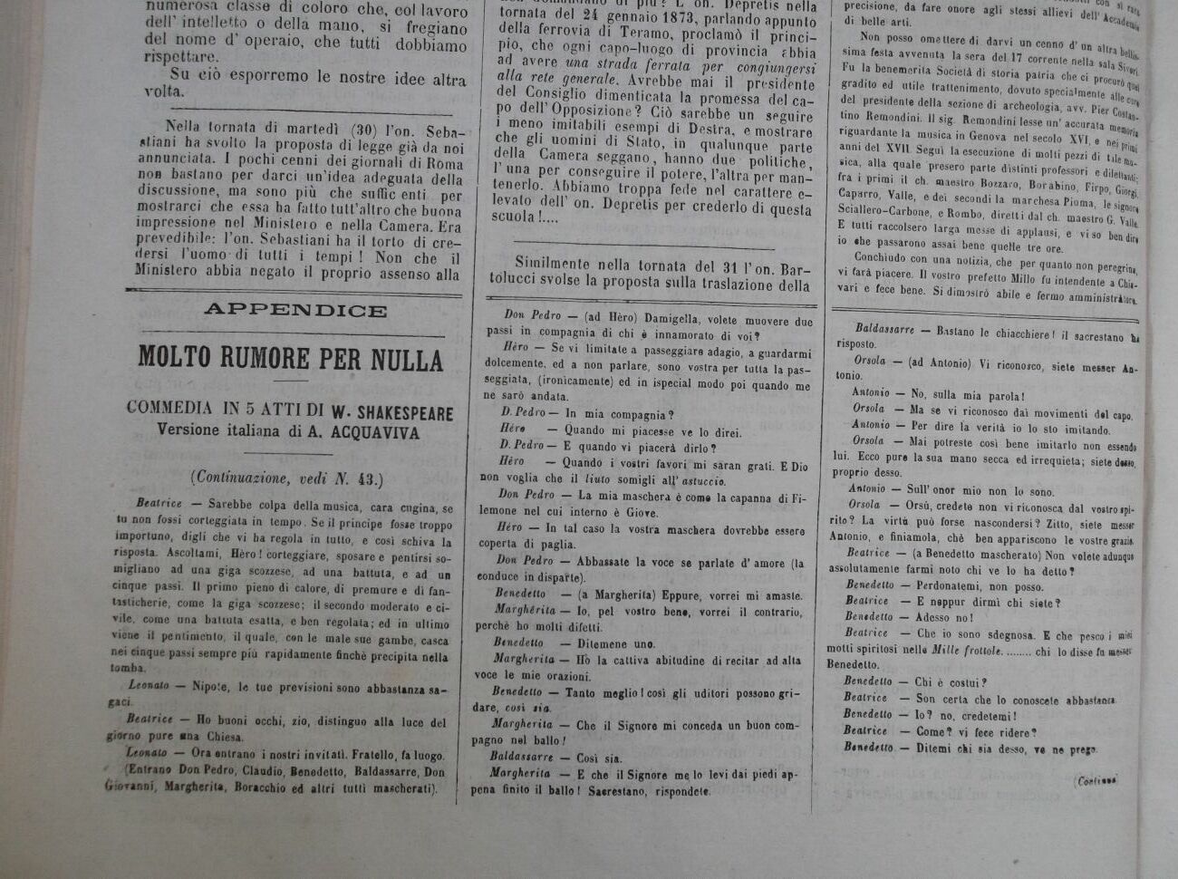 Beatrice Sarebbe colpa della musica, cara cugina, se fu non fossi corteggiata in tempo. Se il principe fosse troppo importuno, digli cbe vi ba regola in tutto, e cosi schiva la risposta. Ascoltami, Hèro ! corteggiare, sposare e pentirsi somigliano ad una giga scozzese, ad una battuta, e ad un cinque passi. Il primo pieno di calore, di premure e dì fantasticherie, come la giga scozzese; il secondo moderato e civile. come una battuta esatta, e ben regolata; ed in ultimo viene il pentimento, il quale, con le male sue gambe, casca nei ciaque passi sempre più rapidamente finché precipita nella tomba.