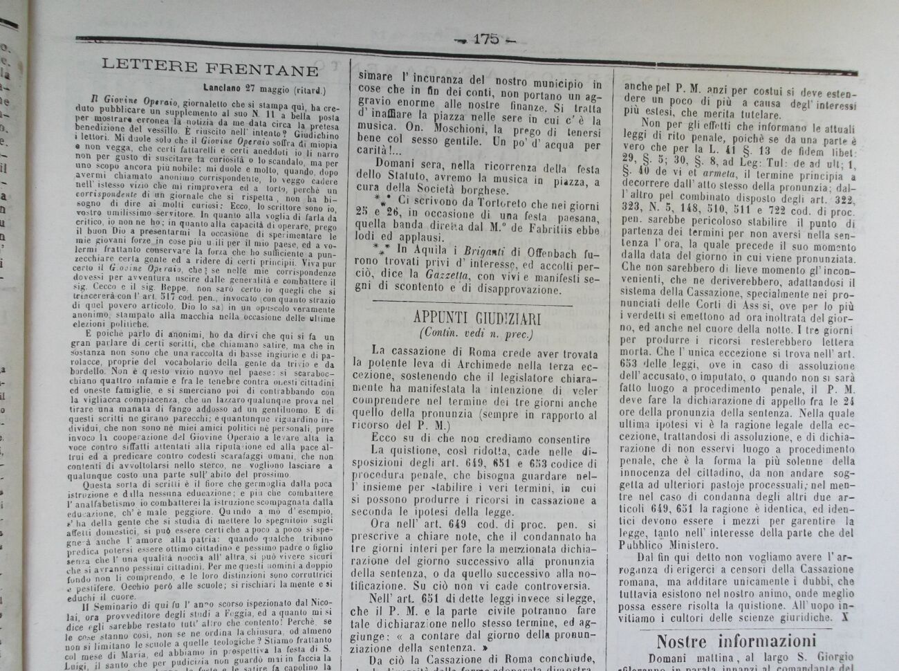Il Giovine Operaio, giornaletto che si stampa qui, ha creduto pubblicare un supplemento al suo N. Ila bella posta per mostrar« erronea la notizia da me data circa la pretesa benedizione del vessillo. È riuscito nell' intento? Giudichino i lettori. Mi duole solo che il Giovine Operaio soffra di miopia e non vegga, che certi fattarelli e certi aneddoti io li narro non per gusto di suscitare la curiosilà o lo scandalo, ma per uno scopo ancora più nobile; mi duole e molto, quando, dopo avermi chiamato anonimo corrispondente, lo veggo cadere nell' istesso vizio che mi rimprovera ed a torto, perchè un corrispondente di un giornale che si rispetta , non ha bisogno di dire ai molti curiosi: Ecco, lo scrittore sono io, vostro umilissimo-servitore. In quanto alla voglia di farla da critico, io non ne ho; in quanto alla capacità di operare, prego il buon Dio a presentarmi la occasione di sperimentare le mie giovani forze, in cose più u.ili per il mio paese, ed a vo-fermi frattanto conservale la forza che ho sufficiente a punzecchiare certa gente ed a ridere di certi principii. Viva pur certo il G.ovine Optraio, che , se nelle mie corrispondenze dovessi per avventura uscire dalle generalità e combattere il sig. Cecco e il sig. Beppe; rton sarò certo io quegli che si trincererà con 1' art. 517 cod. pen., invocato (con quanto strazio di quel povero articolo, Dio lo sa) in un opuscolo veramente anonimo, stampato alla macchia nella occasione delle ultime elezioni politiche.