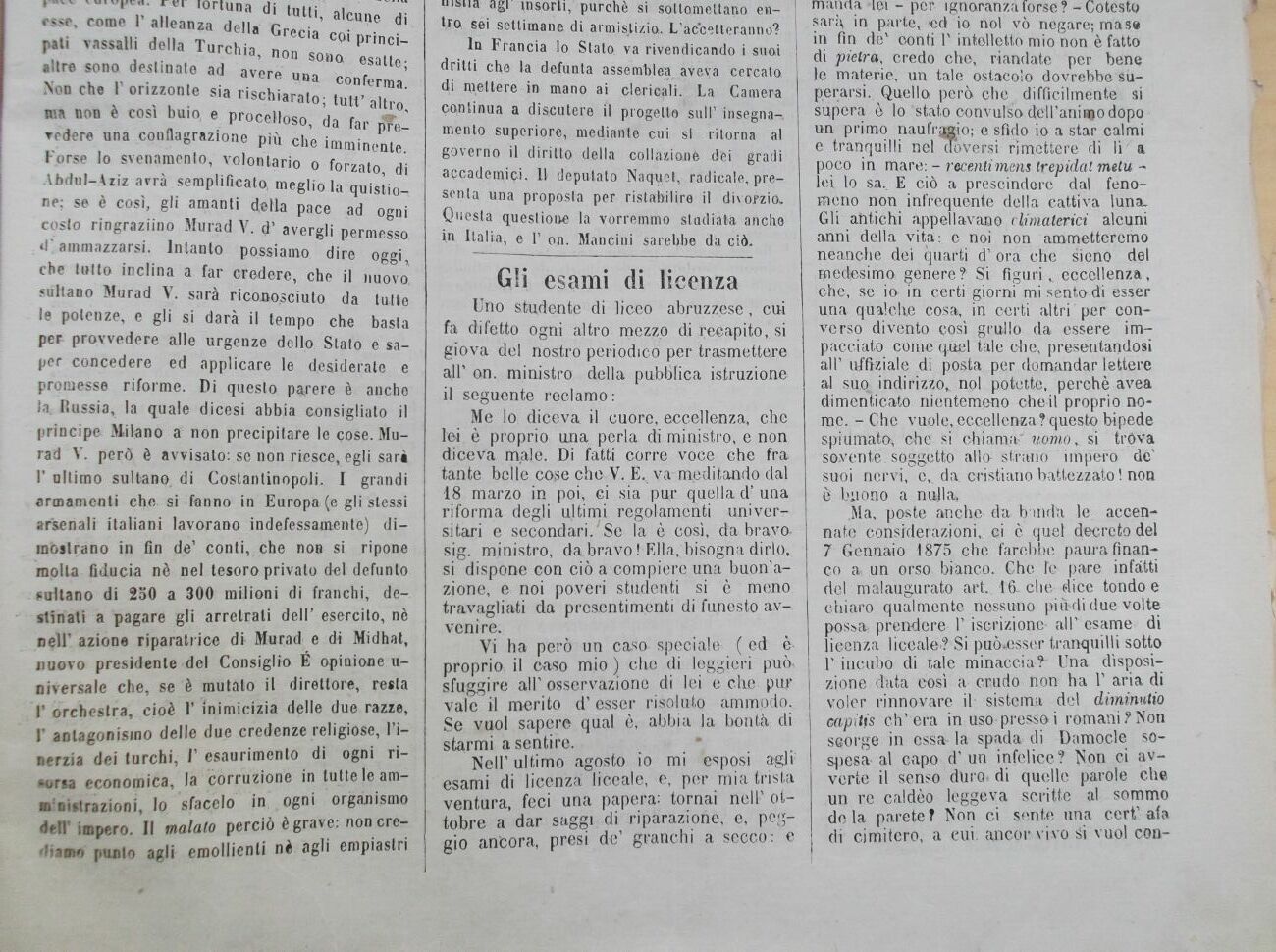 Uno studente di liceo abruzzese, cui fa difetto ogni altro mezzo di recapito, si giova del nostro periodico per trasmettere all' on. ministro della pubblica istruzione il seguente reclamo: