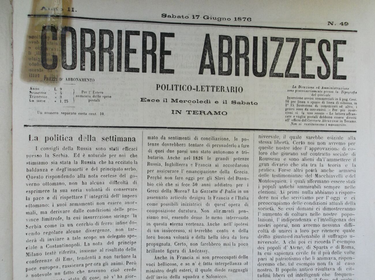del giornale Inserzione avvisi commerciali in & pag. Cent. 1Q per linea o spazio di linea di colonna, in 9a 15. Inserzione di comunicati od altro, i prezzi sono da convenirsi. - Per più inserzioni si fa uno sconto - Le lettere affrancate e vaglia postali debbono essere diretti all' ufficio del Corriere Abruzzese in Teramo.