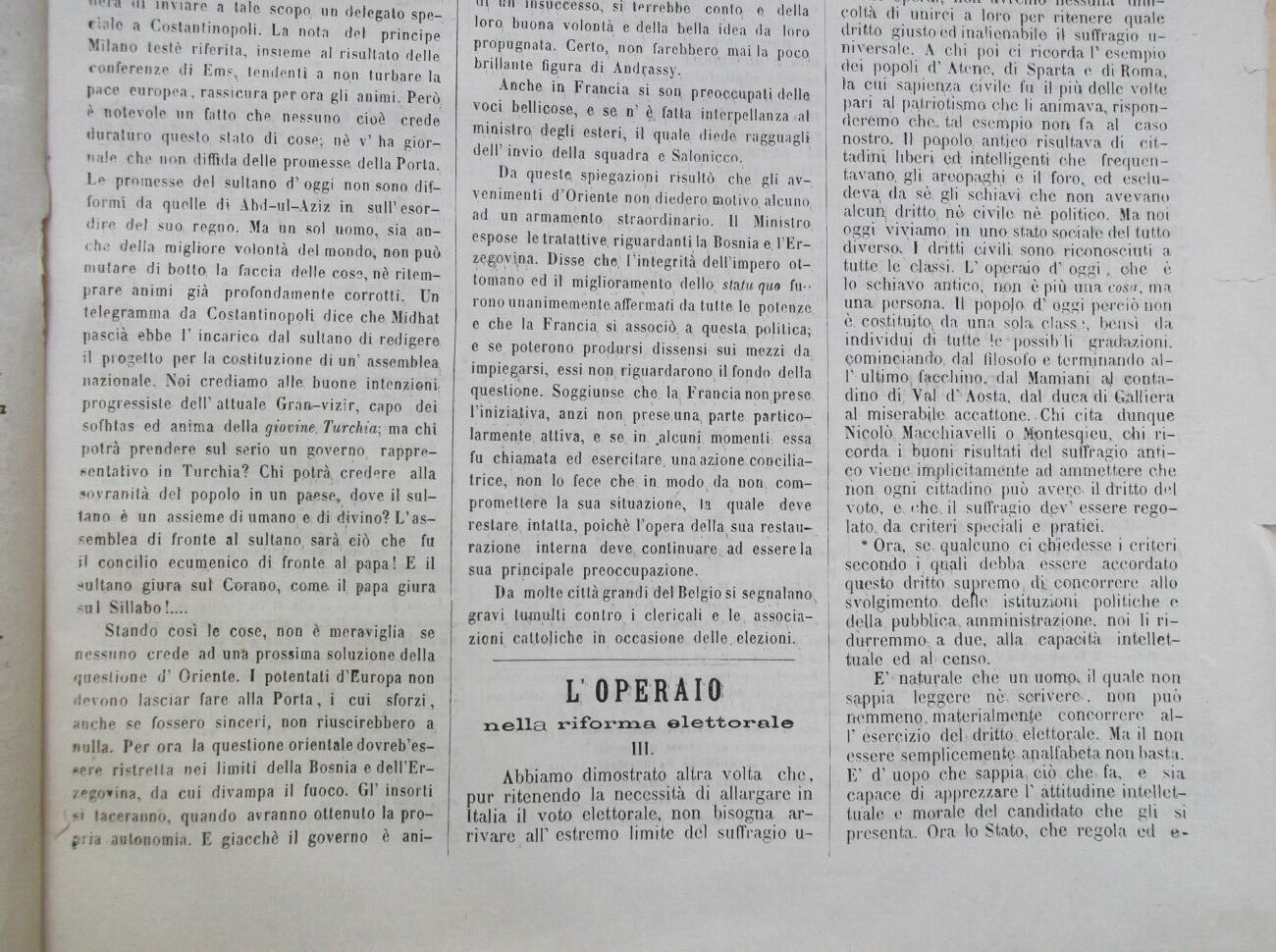 Stando così le cose, non è meraviglia se nessuno crede ad una prossima soluzione della questione d' Oriente. I potentati d'Europa non devono lasciar fare alla Porta, i cui sforzi, anche se fossero sinceri, non riuscirebbero a nulla. Per ora Ja questione orientale dovreb'es-" ere ristretta nei limiti della Bosnia e dell'Erzegovina, da cui divampa il fuoco. GÌ' insorti m taceranno, quando avranno ottenuto la propria autonomia. E giacché il governo è ani-
