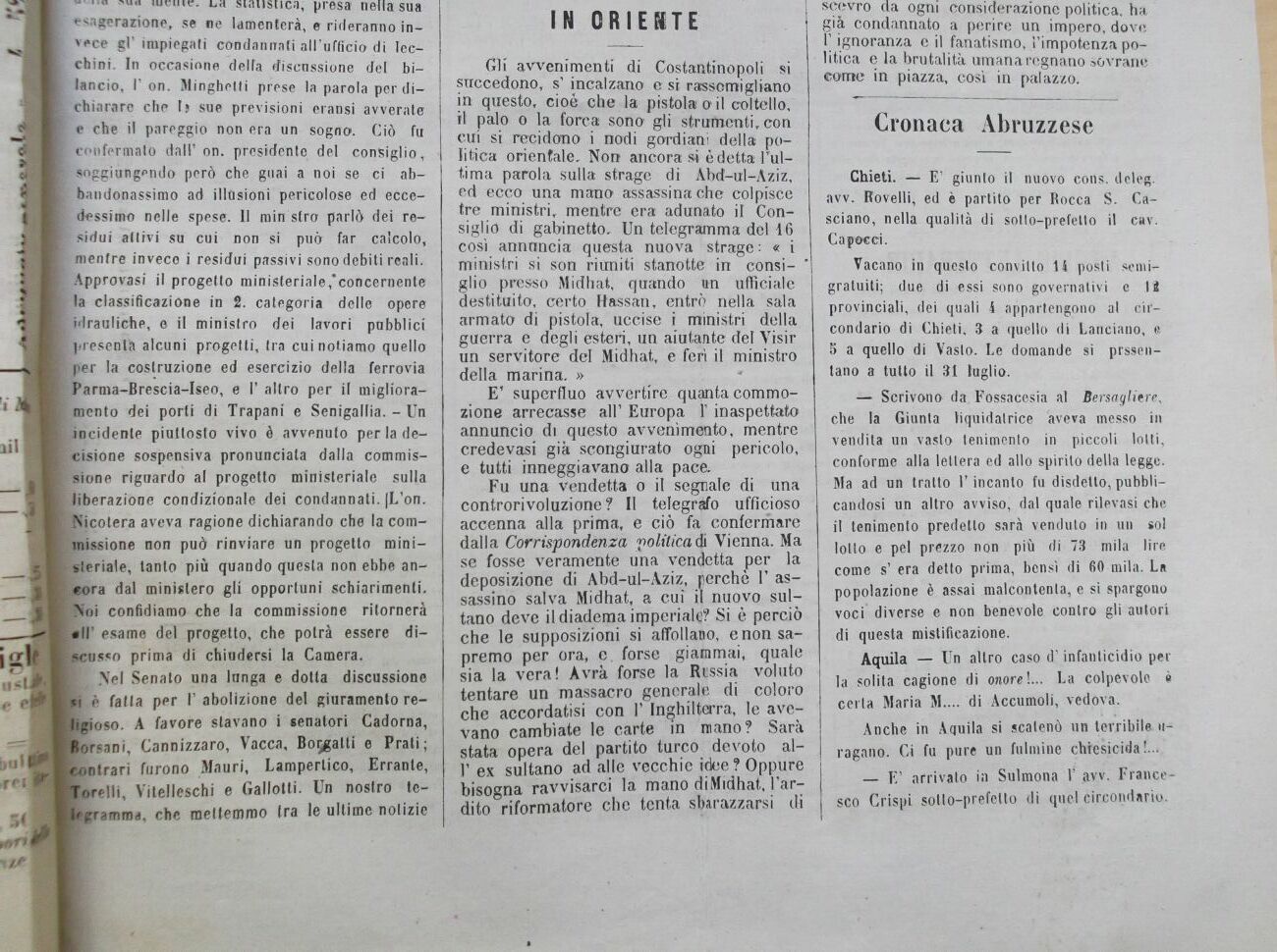 Gli avvenimenti di Costantinopoli si succedono, s' incalzano e si rassomigliano in questo, cioè che la pistola o il coltello, il palo o la forca sono gli strumenti, con cui si recidano i nodi gordiani della politica orientale. Non ancora si è detta l'ultima parola sulla strage di Abd-ul-Aziz, ed ecco una mano assassina che colpisce tre ministri, mentre era adunato il Consiglio di gabinetto. Un telegramma del 16 così annuncia questa nuova strage: « i ministri si son riuniti stanotte in consiglio presso Midhat, quando un ufficiale destituita, certo Hassanr entrò nella sala armata di pistola, uccise i ministri della guerra e degli esteri, un aiutante del Visir un servitore del Midhat, e ferì il ministro della marina. »