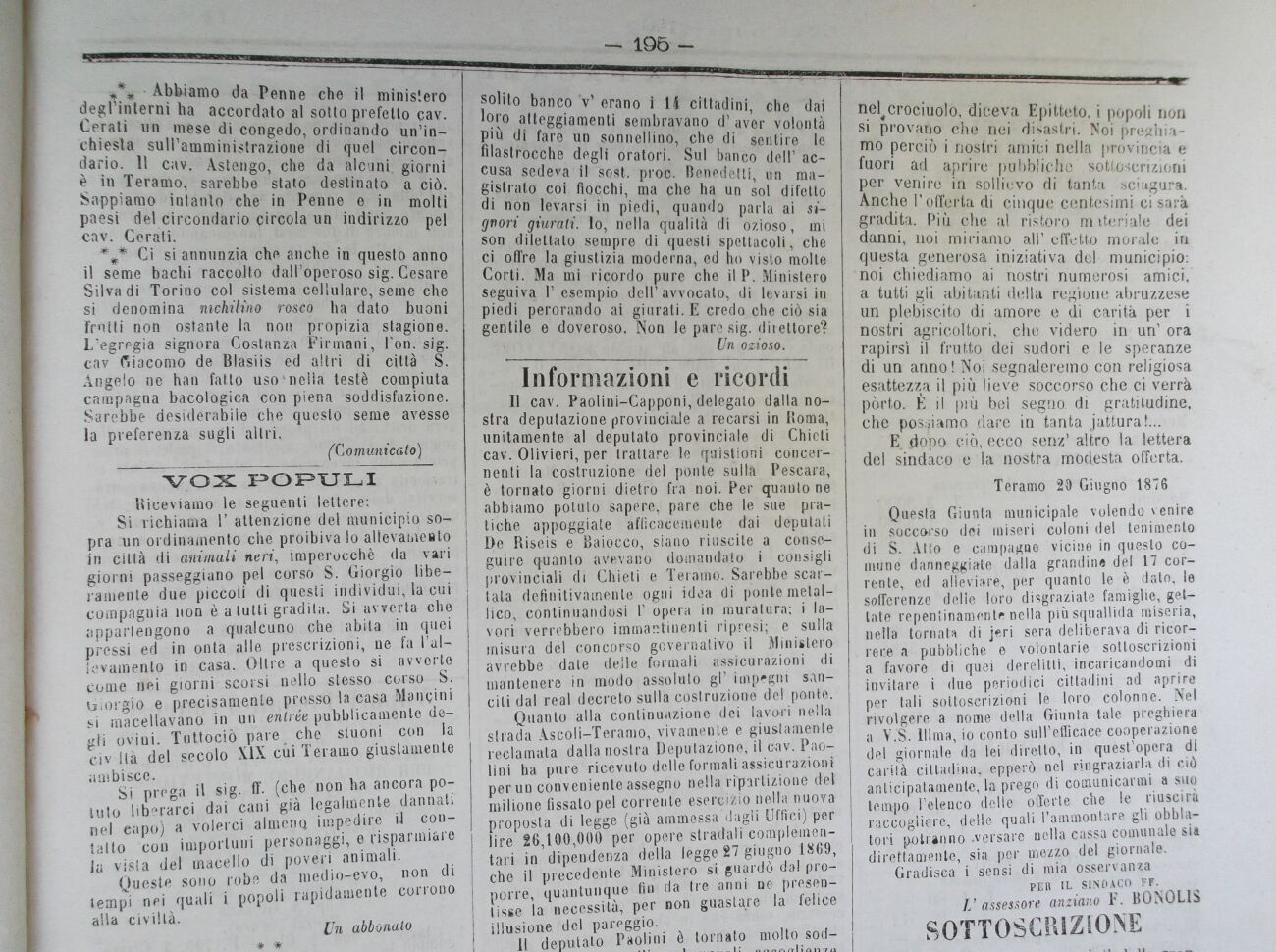 Il cav. Paolini-Capponi, delegato dalla nostra deputazione provinciale a recarsi in Roma, unitamente al deputato provinciale di Chieti cav. Olivieri, per trattare le quistioni concernenti la costruzione del ponte sulla Pescara, è tornato giorni dietro fra noi. Per quanto ne abbiamo potuto sapere, pare che le sue pratiche appoggiate aflìcacemente dai deputati De Riseis e Baiocco, siano riuscite a conseguire quanto avevano domandato i consigli provinciali di Chieti e Teramo. Sarebbe scartata definitivamente ogni idea di ponte metallico, continuandosi 1' opera in muratura; i lavori verrebbero immar.tinenti ripresi; e sulla misura del concorso governativo il Ministero avrebbe date delle formali assicurazioni di mantenere in modo assoluto gì' impegni sanciti dal real decreto sulla costruzione del ponte.