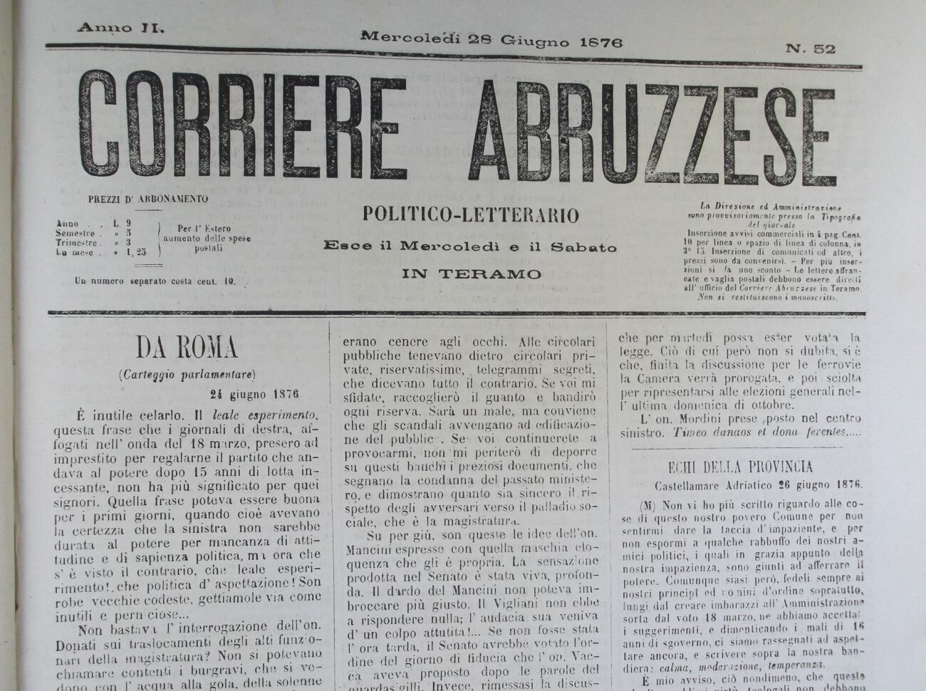 del giornale Inserzione avvisi commerciali in ì pag. Cent. 10 per linea o spazio di linea di colonna, in 3a 13. Inserzione di comunicati od altro, i prezzi sono da convenirsi. - Per più inserzioni si fa uno. sconto - Le lettere affrancate e vaglia postali debbono essere diresti all' ufficio del Corriere Abruzzese in Teramo.
