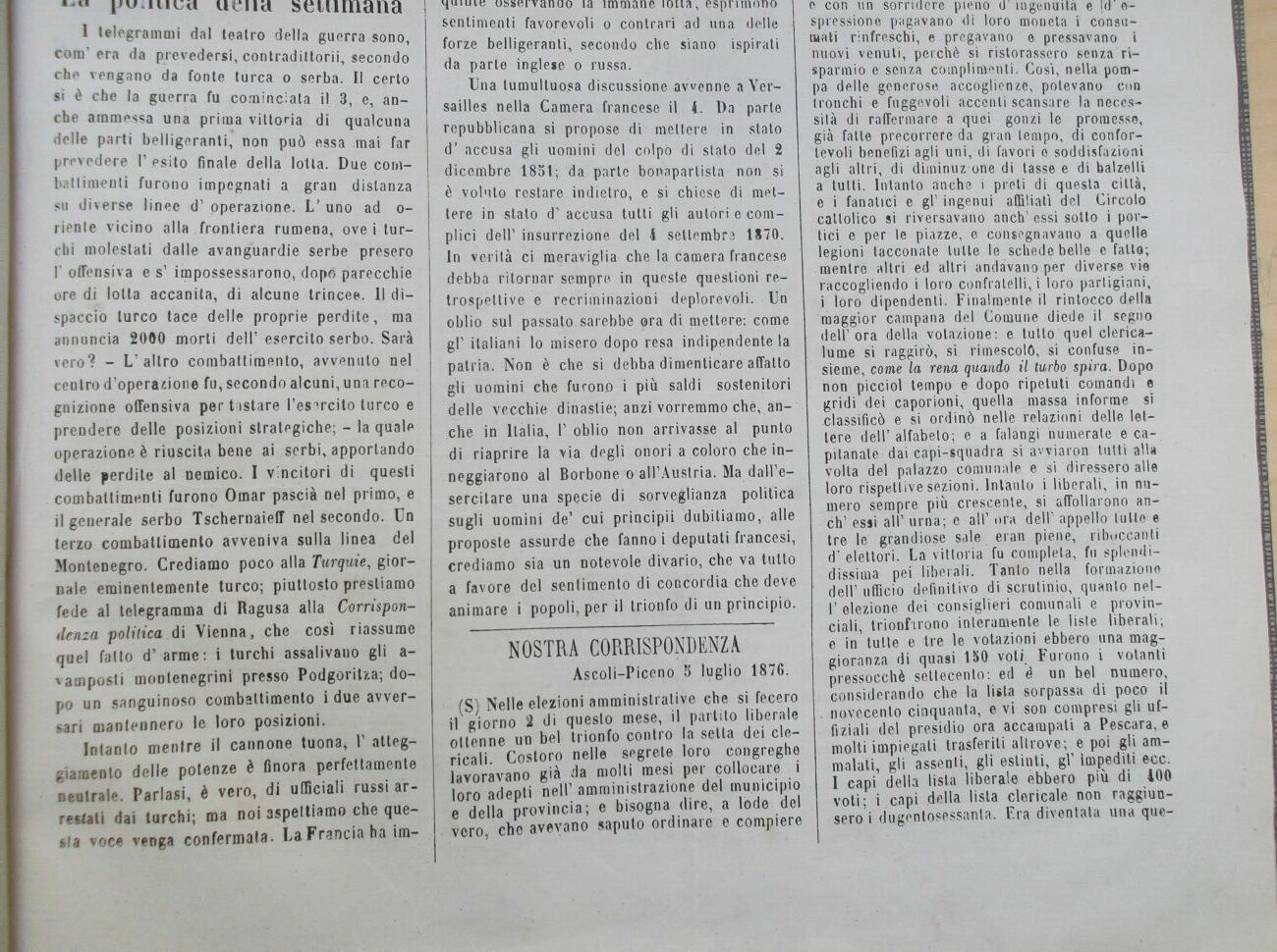 (S) Nelle elezioni amministrative che si fecero il giorno 2 di questo mese, il partito liberale ottenne un bel trionfo contro la setta dei clericali. Costoro nelle segrete loro congreghe lavoravano già da molti mesi per collocare i loro adepti nelP amministrazione del municipio e della provincia; e bisogna dire, a lode del vero, che avevano saputo ordinare e compiere