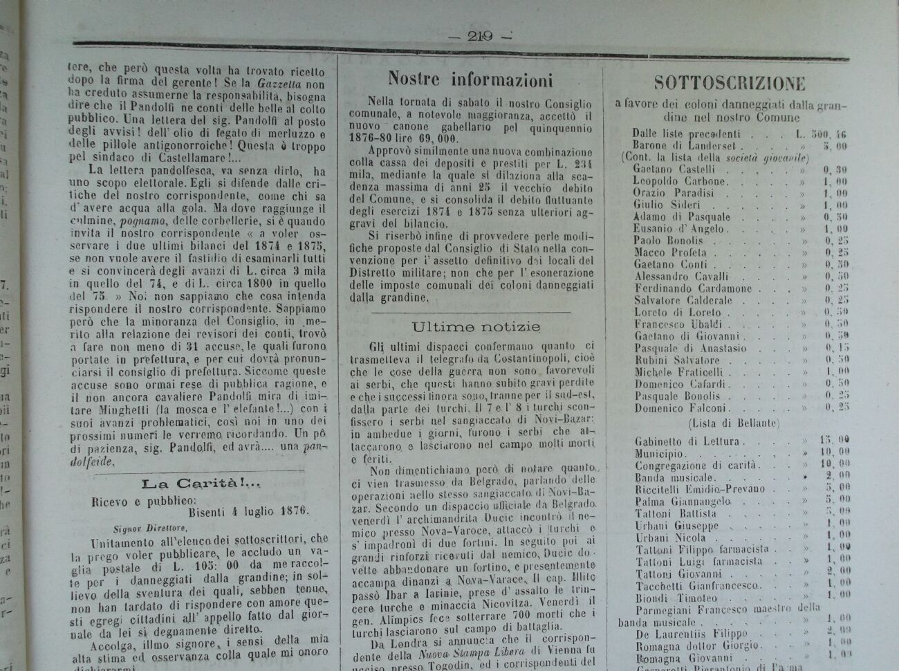 Nella tornala di sabato il nostro Consiglio comunale, a notevole maggioranza, accettò il nuovo " cariane gabellano pel quinquennio 1876-80 lire 69,000.