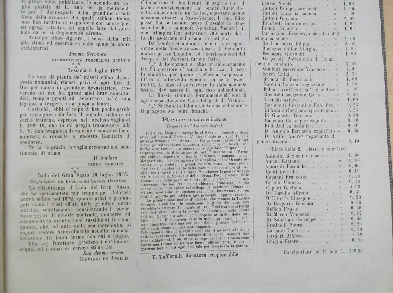 La cittadinanza d' Isola del Gran Sasso, che ha sperimentato pur troppo per dolorosa prova subita nel 1872, quanto gravi e prolungali siano i tristi elTotli della grandine devastatrice. sentitamelo considerando ì poveri danneggiali di coleste contrade, concorre ad hll<'Buarne la sventura col sussidio di lire cinquanta, che, ad onta della sua meschinità, si augura vedere benevolmente accolto in consi-deiMzione del buon animo con cui è largito.