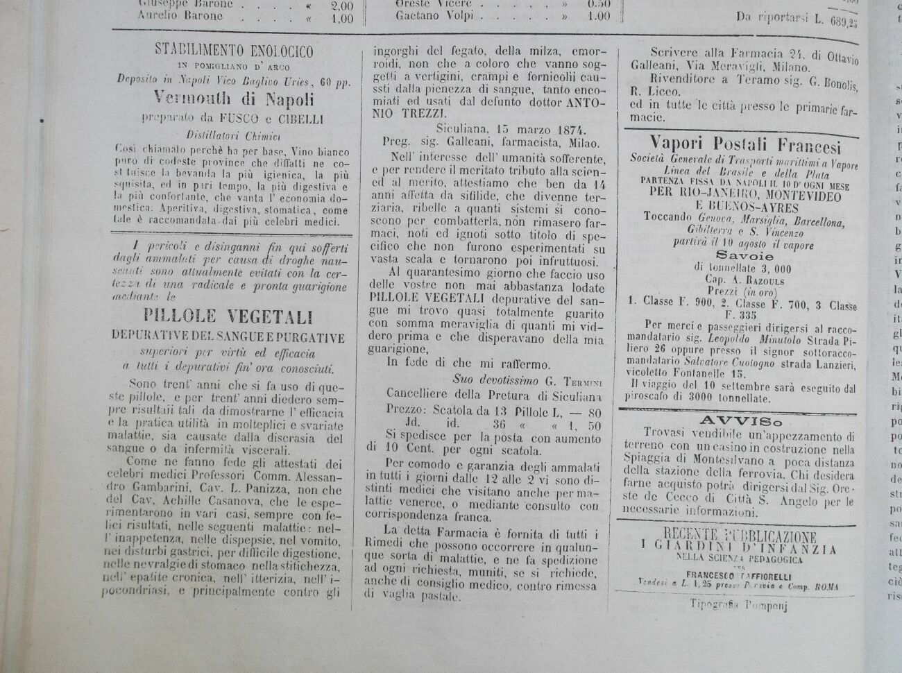 Al quarantesimo giorno che faccio uso delle vostre non mai abbastanza lodate PILLOLE VEGETALI depurative del sangue mi trovo quasi totalmente guarito con somma meraviglia di quanti mi vid-dero prima e che disperavano della mia guarigione,