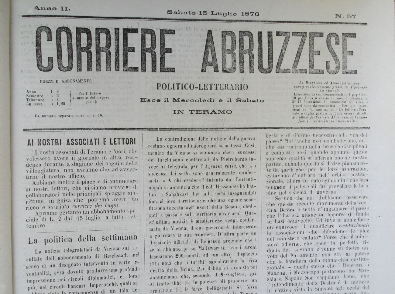 1 nostri associati di Teramo e fuori, che volessero avere il giornale in altra resi^ denza durante la stagione dei bagni e della villeggiatura, non avranno che ad avvertirne il nostro ufficio.