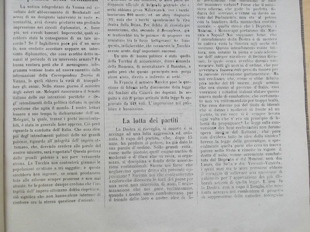 Un alto di buòna politica è stato quello della Turchia di acconsentire, dietro dimanda della Buiuenia, di neutralizzare il Danubio, a patto però che questo principato non porga alcun aiuto, diretto o indiretto ai serbi. *