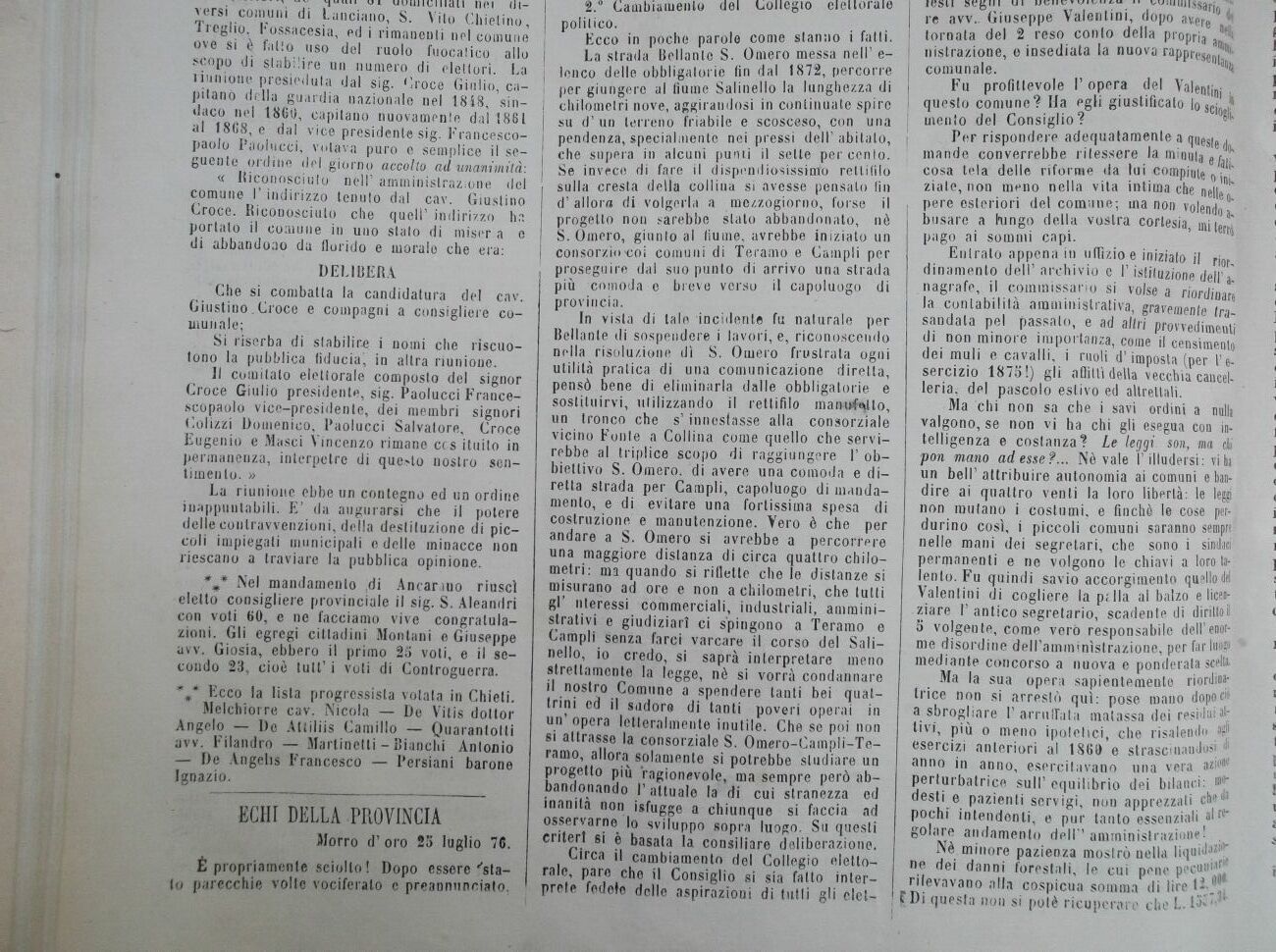 Quindi nella sera del 19 luglio, proposta appena fra 7 ore nel ritorno dell' egregio cittadino dolt. Croce Giovanni da Kip teatina, ove esercita la professione Ira l1 amore e ii rispetto di quei cittadini, tenevnsi nella casa del sig. Francescopaolo Paoìucci una riunione elettorale amministrativa. Vi presero p.ìrle 53 elettori amministrativi, oltre 8 assenti che si fecero rappresentare, e 40 elettori politici, tra quelli rivestili della doppia divisa elettorale e Ira quelli soltanto elettori politici, perchè e-lettori del 1848 oltre a diversi cittadini venuti dalle diverse contrade di lontane campagne a rappesenlare i propri interessi.. Il numero fu imponente,l'intervento spontaneo. Giova sapere che la lisa politica è composta di 47 elettori e che la lista amministrativa del ,comune risulta di 166 elettori, de' quali 81 domiciliati nei diversi comuni di Lanciano, S. Vito Chietino, Treglio, Fossa cesia, ed i rimanenti nel comune ove si è fallo uso del ruolo fuocalico allo scopo di stabilire un numero di elettori. La riunione presieduta dal sig. ''d'oce Giulio, capitano dilla guardia nazionale nel 1848, sindaco ne) 1860, capitano nuovamente dal 1881 al 1868, e dal vice presidente sig. Francesco-paolo Paoìucci, volava puro e semplice il seguente ordine del giorno accollo ad unanimità: « Riconosciuto nell' amministrazione del