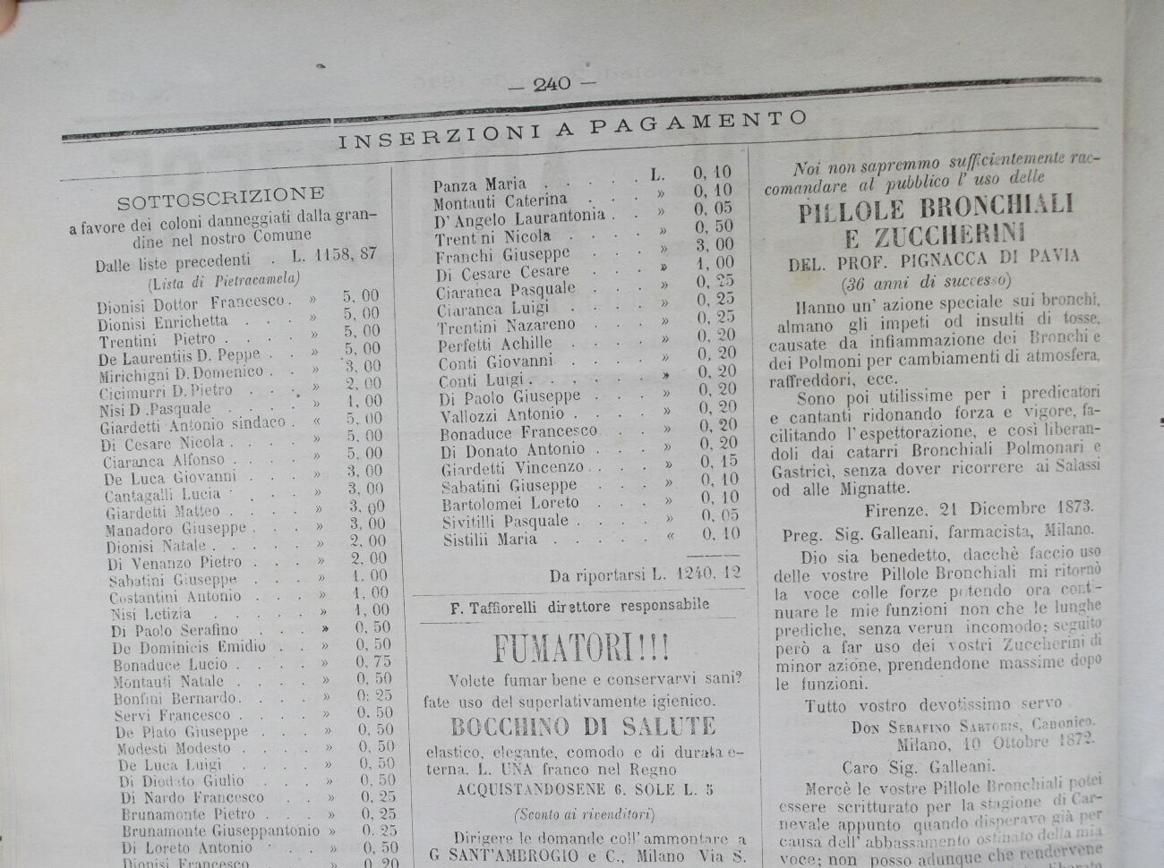 Dio sia benedetto, dacché faccio uso delle vostre Pillole Bronchiali mi ritornò la voce colle forze potendo ora cont-nuare le mie funzioni non che le lunghe prediche, senza verun incomodo; seguito però a far uso dei vostri Zuccherini di minor azione, prendendone massime dopo le funzioni.