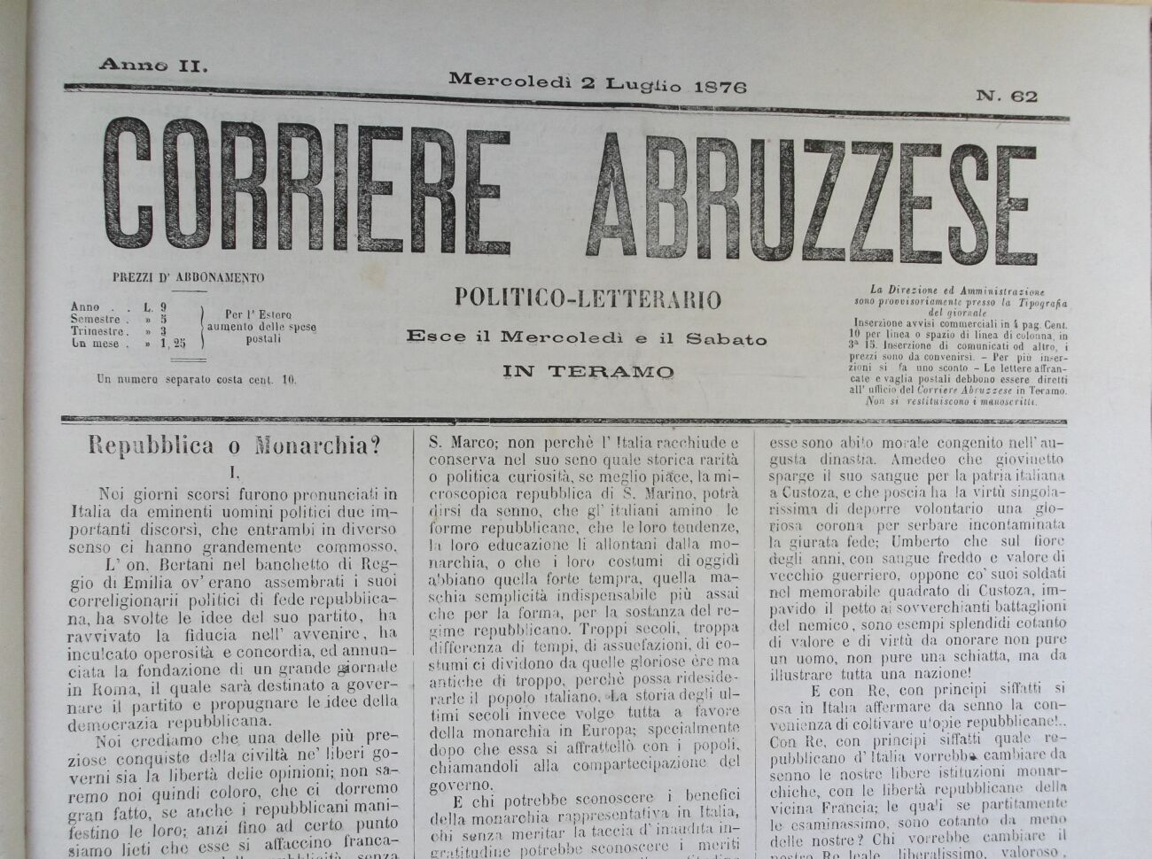 del giornale Inserzione avvisi commerciali in i pag. Cent, li) per linea o spazio di linea di colonna, in 3a 15. Inserzione di comunicati od altro, i prezzi sono da convenirsi. - Per più inserzioni si fa uno sconto - Le lettere affrancale e vaglia postali debbono essere diretti all' ufficio del Corriere Abruzzese in Teramo.