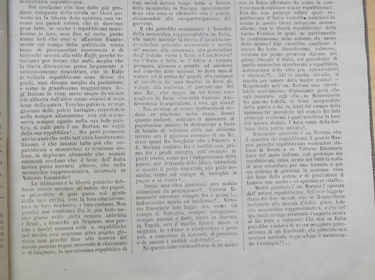 osa in Italia affermare ria senno la convenienza di coltivare u!opie repubblicane!.. Con Re, con principi siffatti quale repubblicano di' Italia vorrebbe cambiare da senno le nostre libere istituzioni monarchiche, con le libertà repubblicano della vicina Francia;, le qua'i se paratamente le esaminassimo, sono cotanto da meno delle nostre? Chi vorrebbe cambiare il nostro Re leale,, libéralissimo, valoroso , salutato dal primo penalista italiano pel primo liberale d' Italia, col presidente di quella monarchia mascherata a repubblica, antesignano delle idee più conservatrici e clericali?!;.. Ah!" si smetta vivadio, si smetta per amore della madre patria! Rispettiamo neUv on. Bertani una incrollabile convinzione; deploriamo però che egli deputato, egli che.in Montecitorio ha giurato fedeltà al bene inseparabile della patria e del re, tenti dal campo della opinione far prevalere nel campo dei fatti principii e sistemi, i quali scrollano la base del nostro statuto, 1' arca santa della fortuna della patria italiana!...