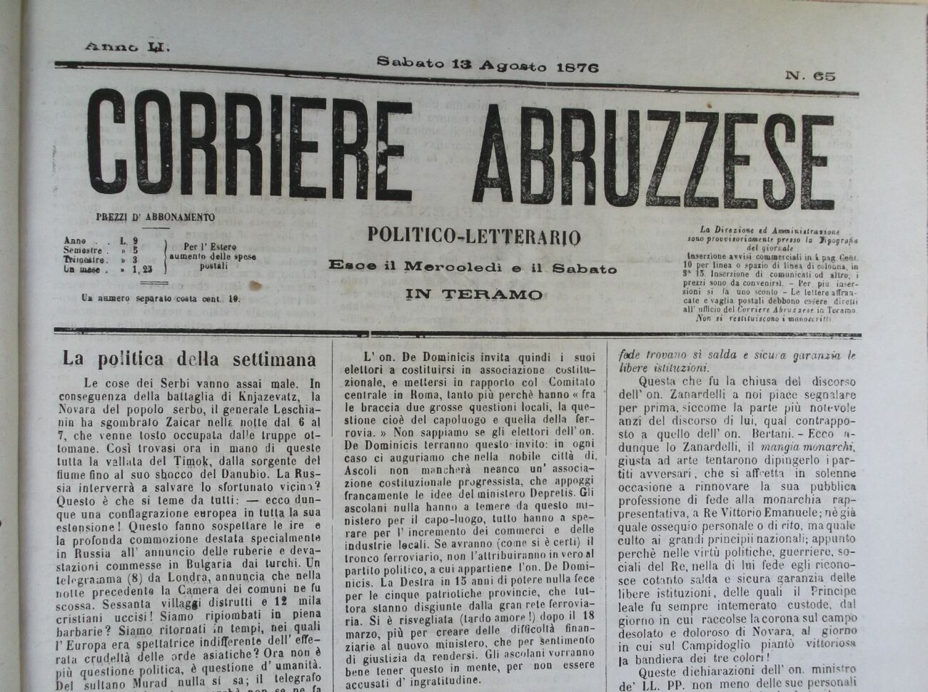 Le cose dei Serbi vanno assai male. In conseguenza della battaglia di Knjazevatz, la Novara del popolo serbo, il generale Lpschia-nin ha sgombralo Zaicar nella notte dal 6 al 7, che venne tosto occupata dalle truppe ottomane. Così trovasi ora in mano di queste ! tutta la vallata del Timo,c, dalla sorgente del fiume fino al suo shocco del Danubio. La Russia interverrà a salvare lo sfortunato vicini? Questo è che si teme da tutti: ecco dunque una conflagrazione europea in tutta la sua estensione! Questo fanno sospettare le ire e la profonda commozione destata specialmente i in Russia air annuncio deUe ruberie e devastazioni commesse in Bulgaria dai turchi. Un telegramma (8) da Londra, annuncia che nella notte precedente la Camera dei comuni ne fu scossa. Sessanta villaggi distrutti e 12 mila cristiani uccisi ! Siamo ripiombati in piena barbarie? Siamo ritornati in tempi, nei quali FEuropa era spettatrice indifferente dell'efferata crudeltà delle orde asiatiche? Ora non è più questione politica, è questione d' umanità. Del sultano Murad nulla si sa; il telegrafo