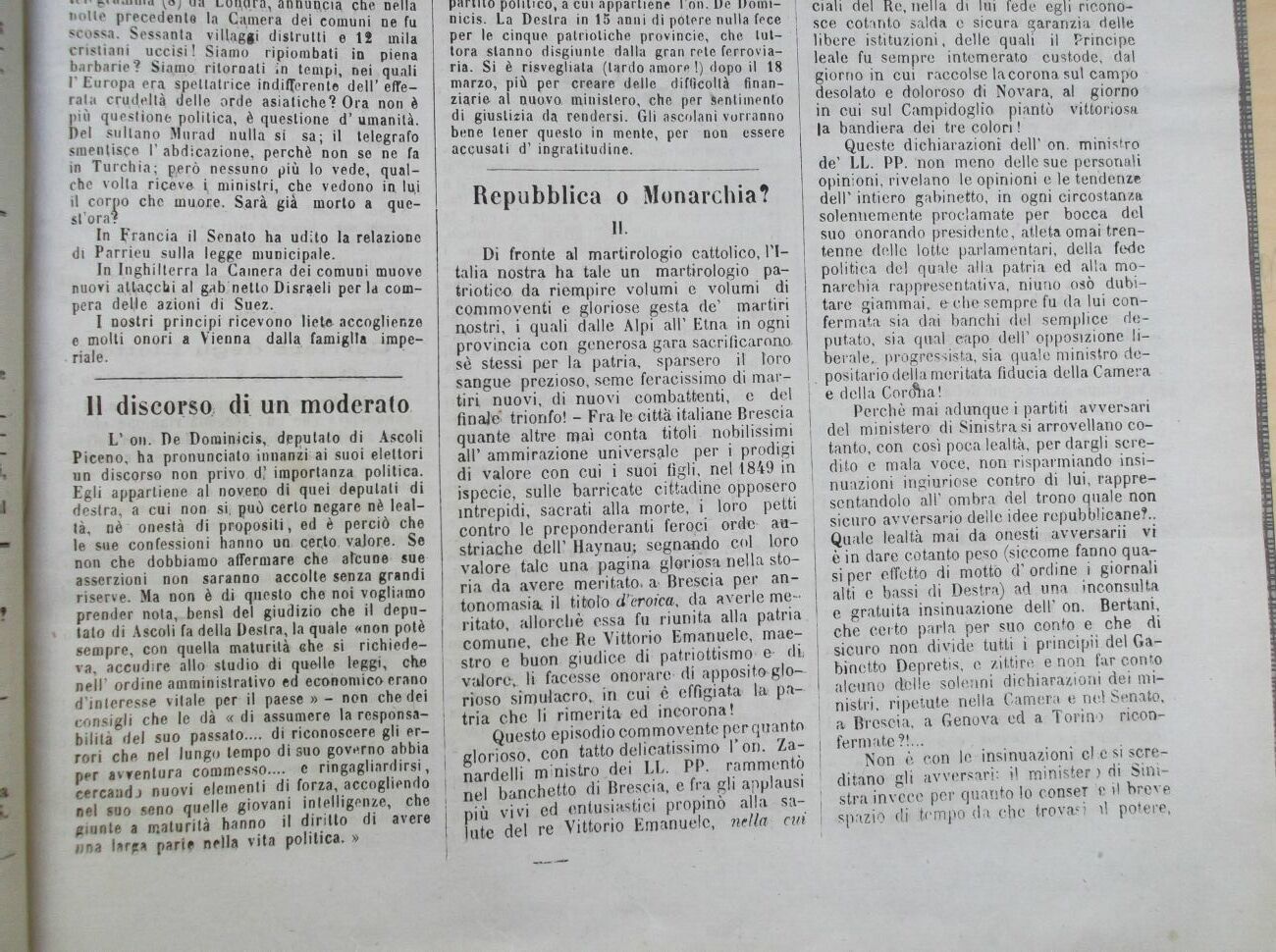 Perchè mai adunque i partiti avversari del ministero di Sinistra si arrovellano cotanto, con così poca lealtà, per dargli scredito e mala voce, non risparmiando insi-, nuazioni ingiuriose contro di lui, rappresentandolo all' ombra del trono quale non sicuro avversario delle idee repubblicane?.. Quale lealtà mai da onesti avversarii vi è in dare cotanto peso (siccome fanno quasi per effetto di motto d' ordine i giornali alti e bassi di Destra) ad una inconsulta e gratuita insinuazione dell' on. Bertani, , che certo parla per suo conto e che di sicuro non divide tutti i principi! del Gabinetto Depretis, e zittire e non far conto , alcuno delle solenni dichiarazioni dei mi-j nistri, ripetute nella Camera e nel Senato, ! a Broscia, a Genova ed a Torino ricon-, fermate?!...