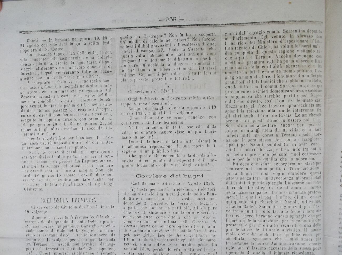 giorni dall' egregio comm. Sorrentino depm.;;., al Parlamento. Egli venuto in Abruzzo cu I'incarico del Ministero d'ispezionare l'Istituto tecnico di Chicli, ha voluto formarsi un j. dea completa di questa regione visitando anche Aquila e Teramo. Accollo dovunque e<>a affettuòsa premura egli ha portato seco o limi ricordanza della cordialità abruzzese che hn onoralo in lui I'eminente uomo politico, I>-gregio amministratore, il fondatore duino dei grandiosi istituti tecnici che si abbiano in Ital a, quello di Pot i ci. Il comm. Son ent no g nnse qii pro\ eniente da Chiedi domenica scorsa,e siccosie si supponeva che sarebbe parlilo per Napoli col treno diretto, così 1 on. ex deputato cav. Mezzanotte gli fece trovare apparecchiata una splendida refezione alla quale intervenne fra gji altri anche 1" on. de Riseis. Le amichevoli premuro cji quest' ultimo indussero poi I'on. Sorrentino ad accettare ancora per qualche giamo ospitalità nella di lui villa, ed a fare lunedì uniti timi eorsa a Teramo donde tornarono la sera stessa. Jori poi a me zzog orno riparti per Napoli, soddisfatto di aver conosciuti i nostri ubruzzi, e lasciando tra noi la più bella impressione po' suoi modi cortesissi-mi e per le rare qualità che lo adornano.