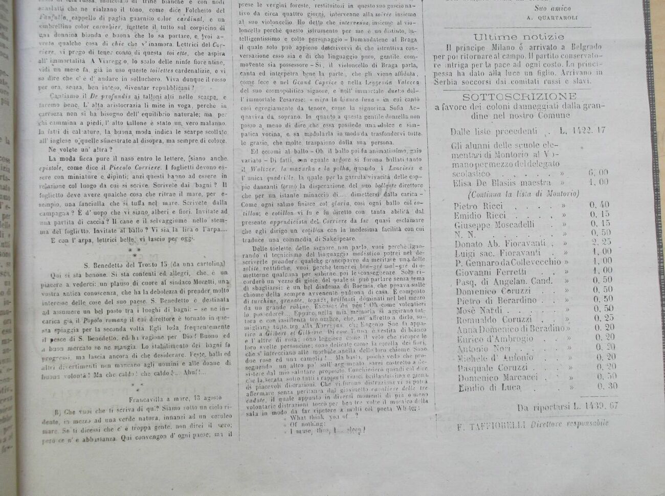 Le invio lire 73, 10 raccolte in Monlepagano a favore dei coloni di cotesto comune danneggiati dalla grandine in giugno ultimo. La relativa lista delle offerte gliela trasmetto pure con preghiera di pubblicarla, in un con la presente, nel prossimo numero del suo accreditato giornale per mio discarico verso gli otre renti.